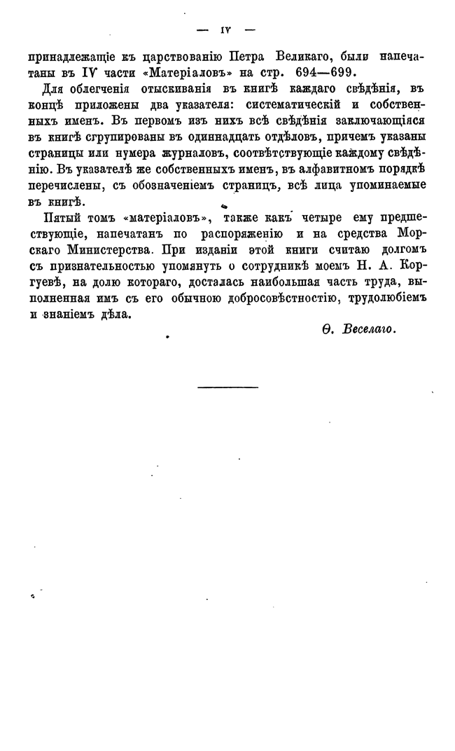 Первые 5 томов издания «Материалы для истории русского флота», изданные в 1865-1875 гг., были подготовлены историографом Российского флота С. И. Елагиным (1824 — 1868). После его смерти работу по написанию «Материалов...» продолжили его сотрудники и Ф.Ф. Веселаго. Всего же было издано 18 томов в период с 1865 по 1904 гг.