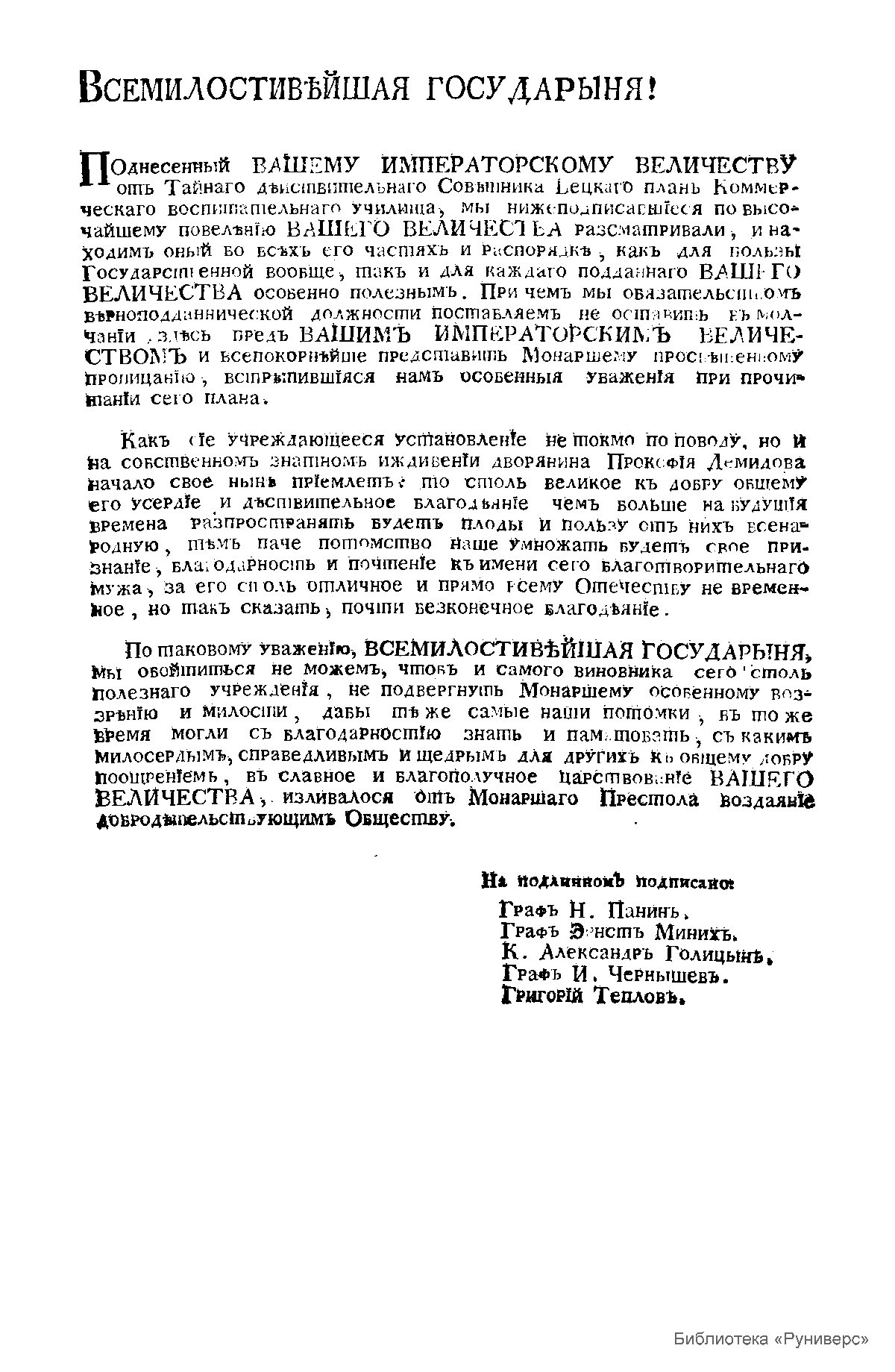 , заботясь о воспитании юношества, повелела учреждать по всей Российской Империи воспитательные училища. Дворянин Прокофий Акинфиевич Демидов представил действительному статскому советнику