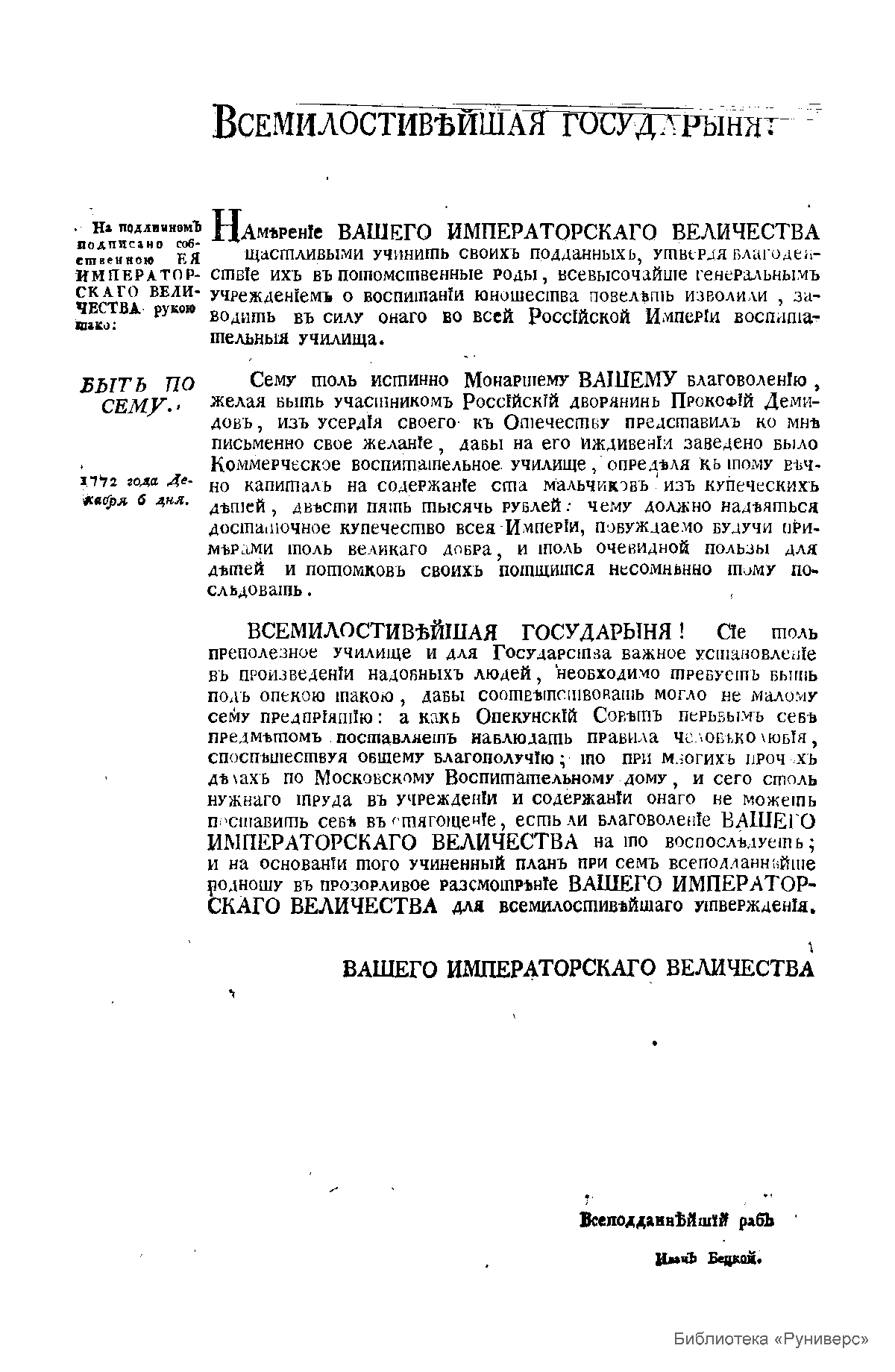 письменное желание основать одно такое училище для ста мальчиков из купеческих семей. На содержание училища Демидов определял капитал в 250 000 рублей. Настоящее издание представляет план училища, поданный Бецким императрице на рассмотрение и утверждение.