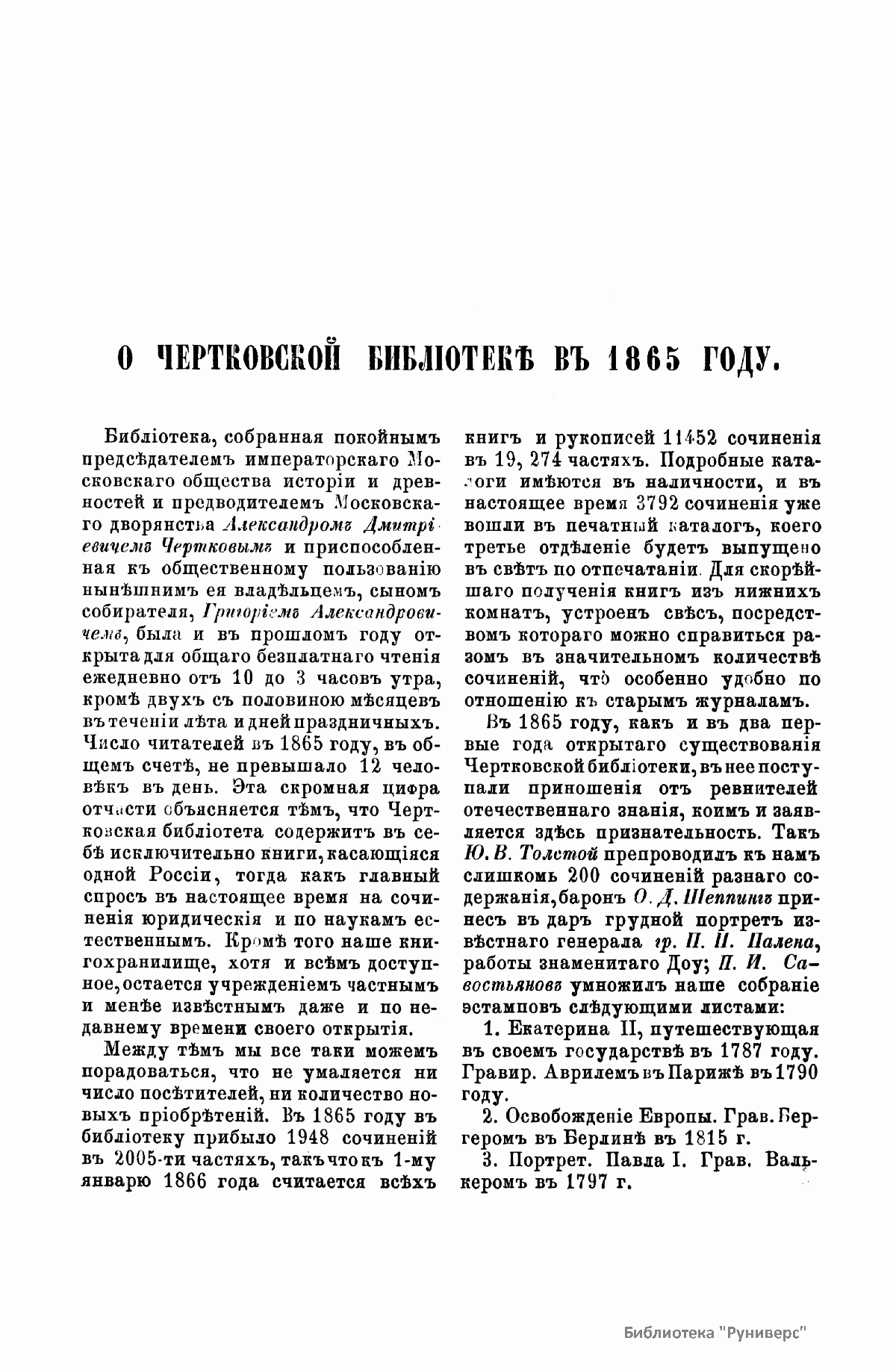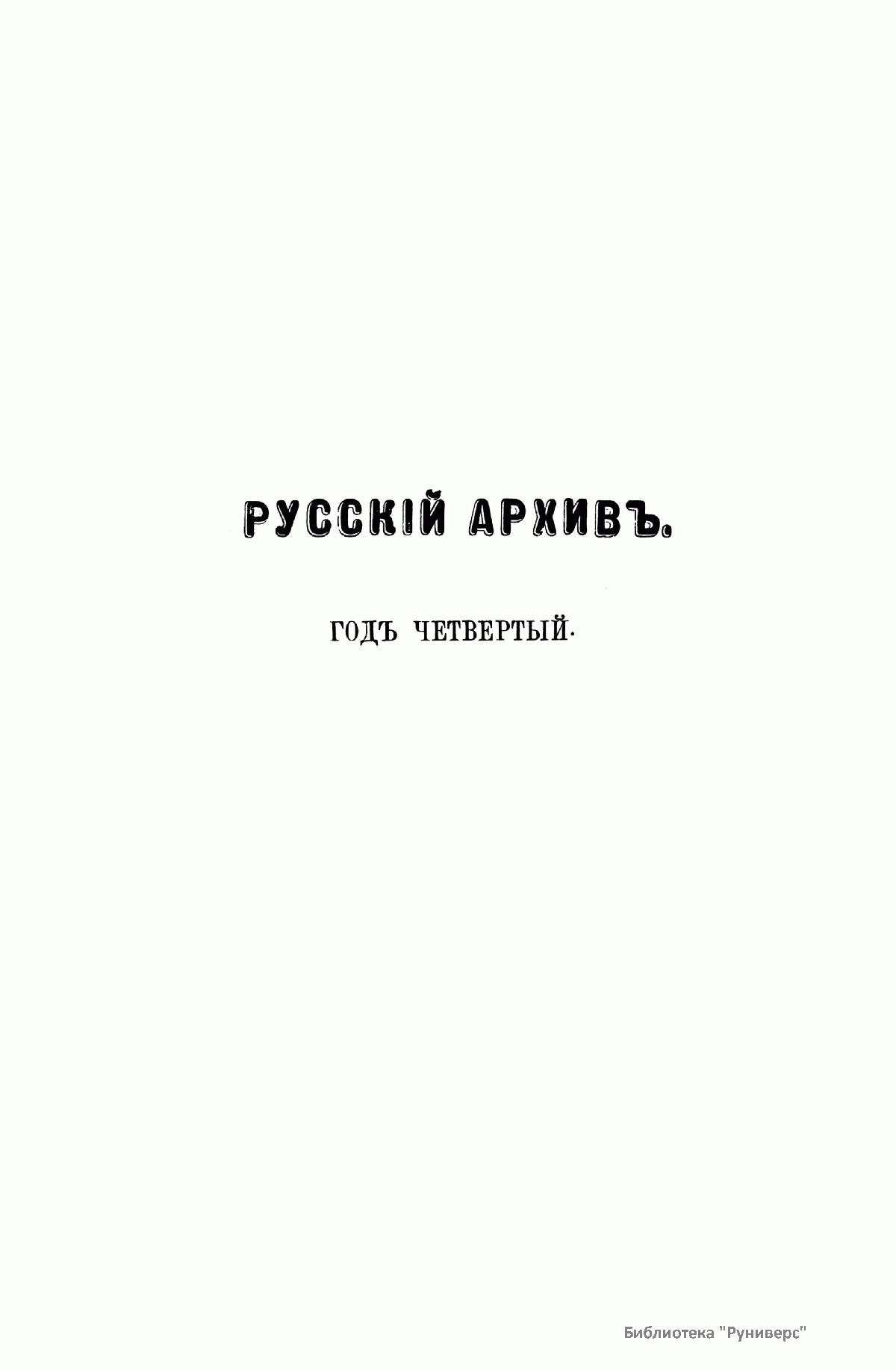 «Русский архив» — ежемесячный историко-литературный журнал, издававшийся в Москве с 1863 по 1917 год. Создателем и продолжительные годы редактором журнала был П. И. Бартенев – историк, археограф, библиограф. Этот журнал называли «живой картиной былого», поскольку он содержал преимущественно публикации неизданных мемуарных, эпистолярных, литературно-художественных и ведомственных документальных материалов, освещавших культурную и политическую историю России в XVIII и XIX вв. По числу опубликованных источников «Русский архив» стоит на первом месте среди русских исторических журналов.