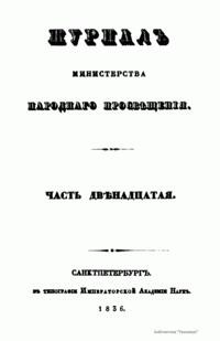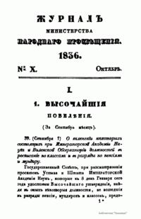 Журнал Министерства народного просвещения выходил с 1834-го по 1917 год. Официальный периодический журнал об успехах просвещения в России. Издатели журнала уверены в том, что «если для каждого человека необходим выход из грубой тьмы невежества и беспрерывное дальнейшее движение к свету, то для народов необходимо попечительное участие правительства в образовании. Только правительство имеет все средства знать и высоту успехов всемирного образования, и настоящие нужды Отечества».