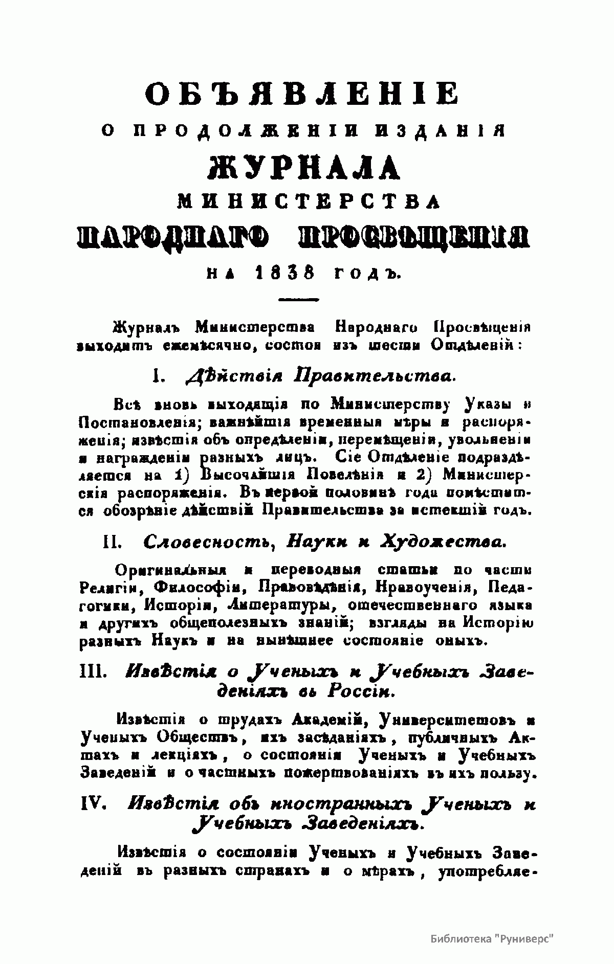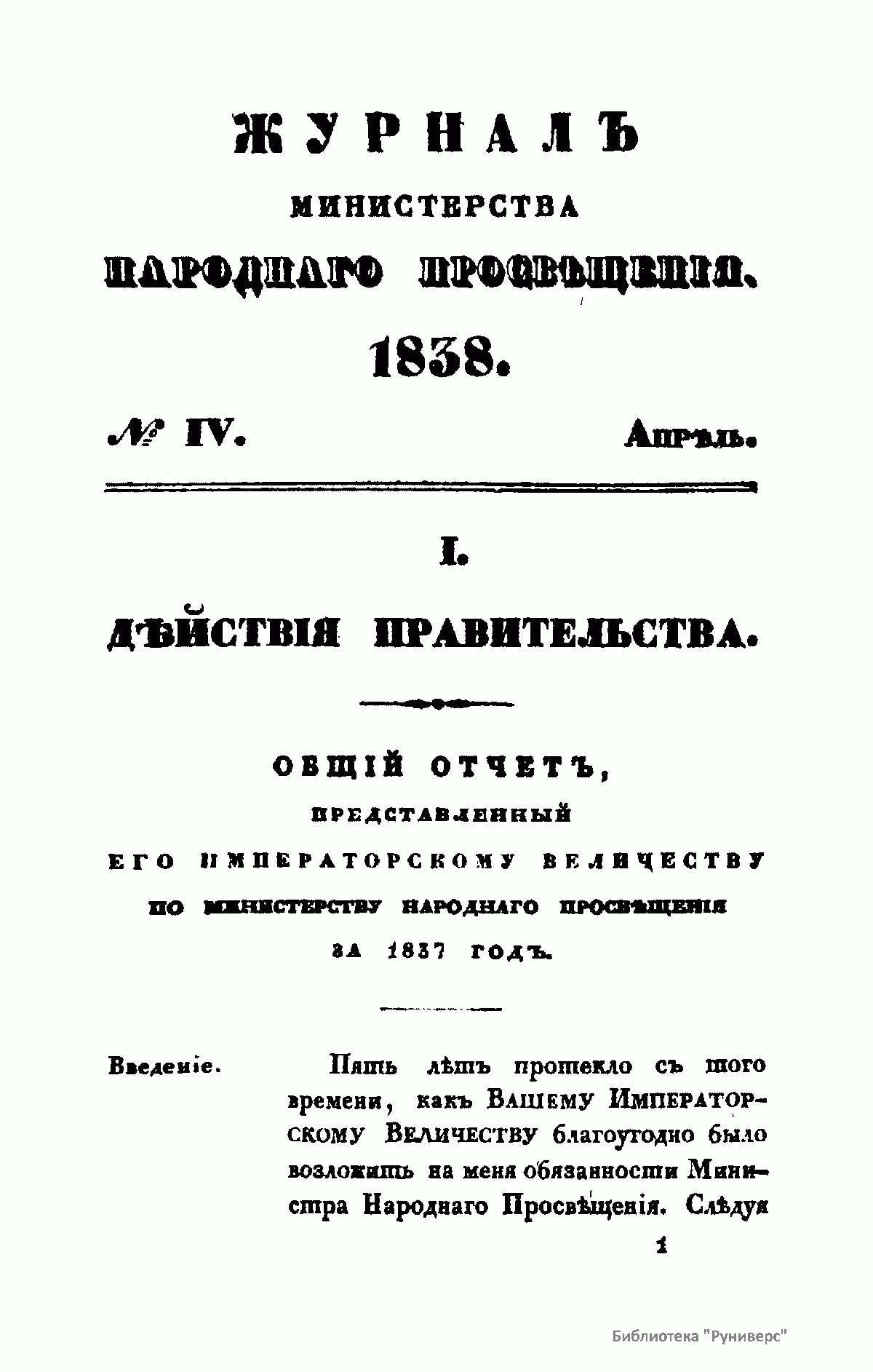 Журнал Министерства народного просвещения выходил с 1834-го по 1917 год. Официальный периодический журнал об успехах просвещения в России. Издатели журнала уверены в том, что «если для каждого человека необходим выход из грубой тьмы невежества и беспрерывное дальнейшее движение к свету, то для народов необходимо попечительное участие правительства в образовании. Только правительство имеет все средства знать и высоту успехов всемирного образования, и настоящие нужды Отечества».