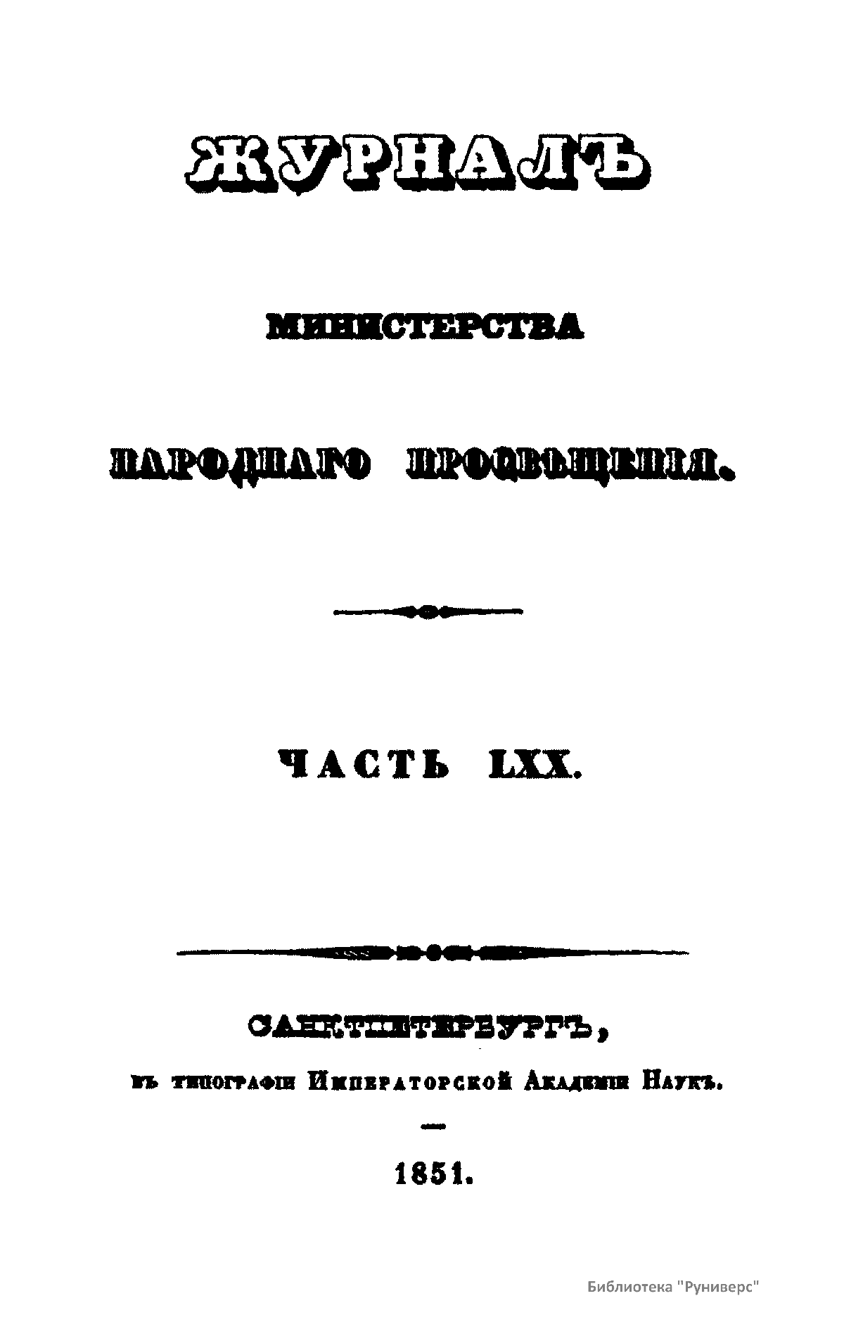 Журнал Министерства народного просвещения выходил с 1834-го по 1917 год. Официальный периодический журнал об успехах просвещения в России. Издатели журнала уверены в том, что «если для каждого человека необходим выход из грубой тьмы невежества и беспрерывное дальнейшее движение к свету, то для народов необходимо попечительное участие правительства в образовании. Только правительство имеет все средства знать и высоту успехов всемирного образования, и настоящие нужды Отечества».
