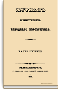 Журнал Министерства народного просвещения выходил с 1834-го по 1917 год. Официальный периодический журнал об успехах просвещения в России. Издатели журнала уверены в том, что «если для каждого человека необходим выход из грубой тьмы невежества и беспрерывное дальнейшее движение к свету, то для народов необходимо попечительное участие правительства в образовании. Только правительство имеет все средства знать и высоту успехов всемирного образования, и настоящие нужды Отечества».