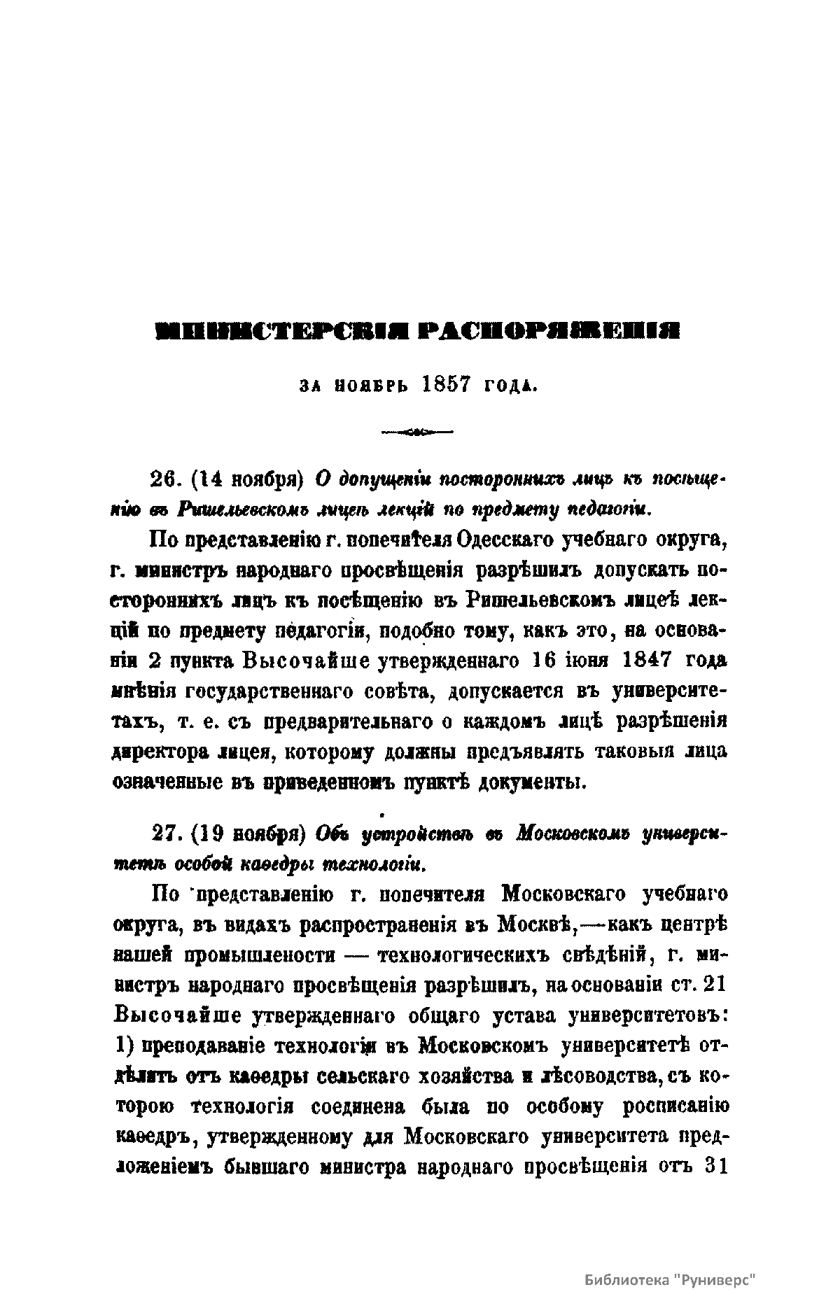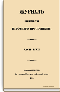 Журнал Министерства народного просвещения выходил с 1834-го по 1917 год. Официальный периодический журнал об успехах просвещения в России. Издатели журнала уверены в том, что «если для каждого человека необходим выход из грубой тьмы невежества и беспрерывное дальнейшее движение к свету, то для народов необходимо попечительное участие правительства в образовании. Только правительство имеет все средства знать и высоту успехов всемирного образования, и настоящие нужды Отечества».