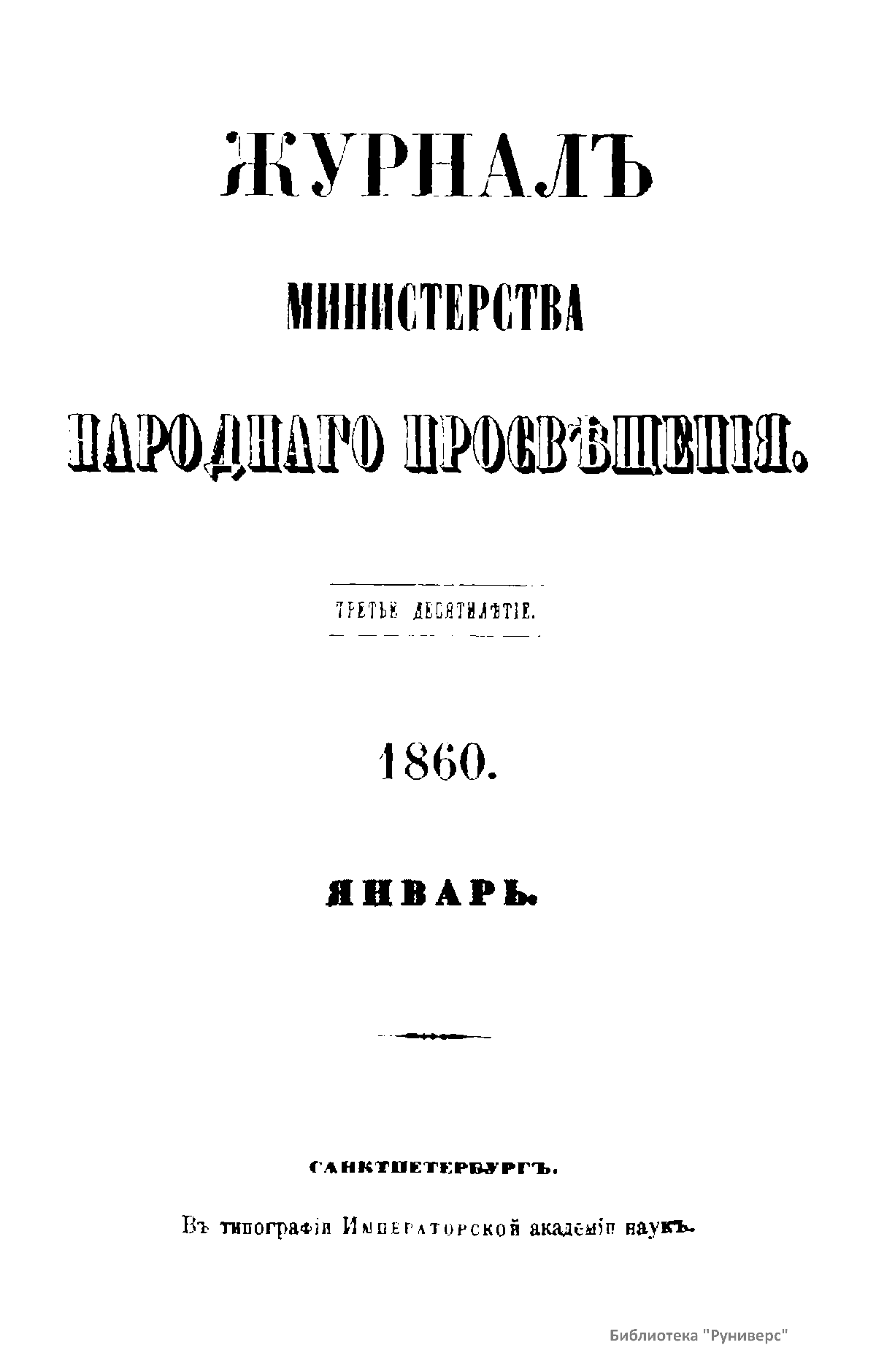 Журнал Министерства народного просвещения выходил с 1834-го по 1917 год. Официальный периодический журнал об успехах просвещения в России. Издатели журнала уверены в том, что «если для каждого человека необходим выход из грубой тьмы невежества и беспрерывное дальнейшее движение к свету, то для народов необходимо попечительное участие правительства в образовании. Только правительство имеет все средства знать и высоту успехов всемирного образования, и настоящие нужды Отечества».