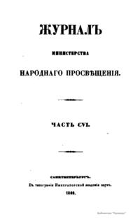 Журнал Министерства народного просвещения выходил с 1834-го по 1917 год. Официальный периодический журнал об успехах просвещения в России. Издатели журнала уверены в том, что «если для каждого человека необходим выход из грубой тьмы невежества и беспрерывное дальнейшее движение к свету, то для народов необходимо попечительное участие правительства в образовании. Только правительство имеет все средства знать и высоту успехов всемирного образования, и настоящие нужды Отечества».