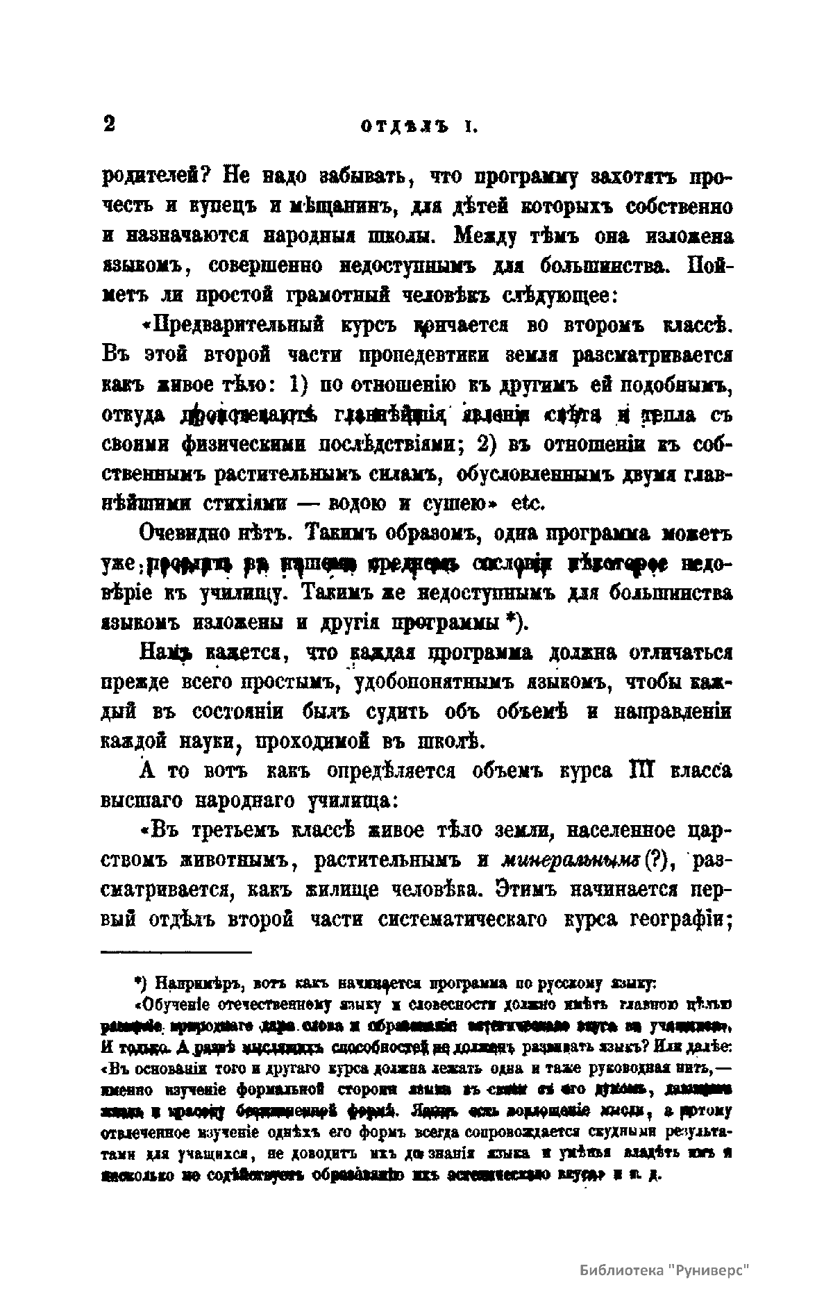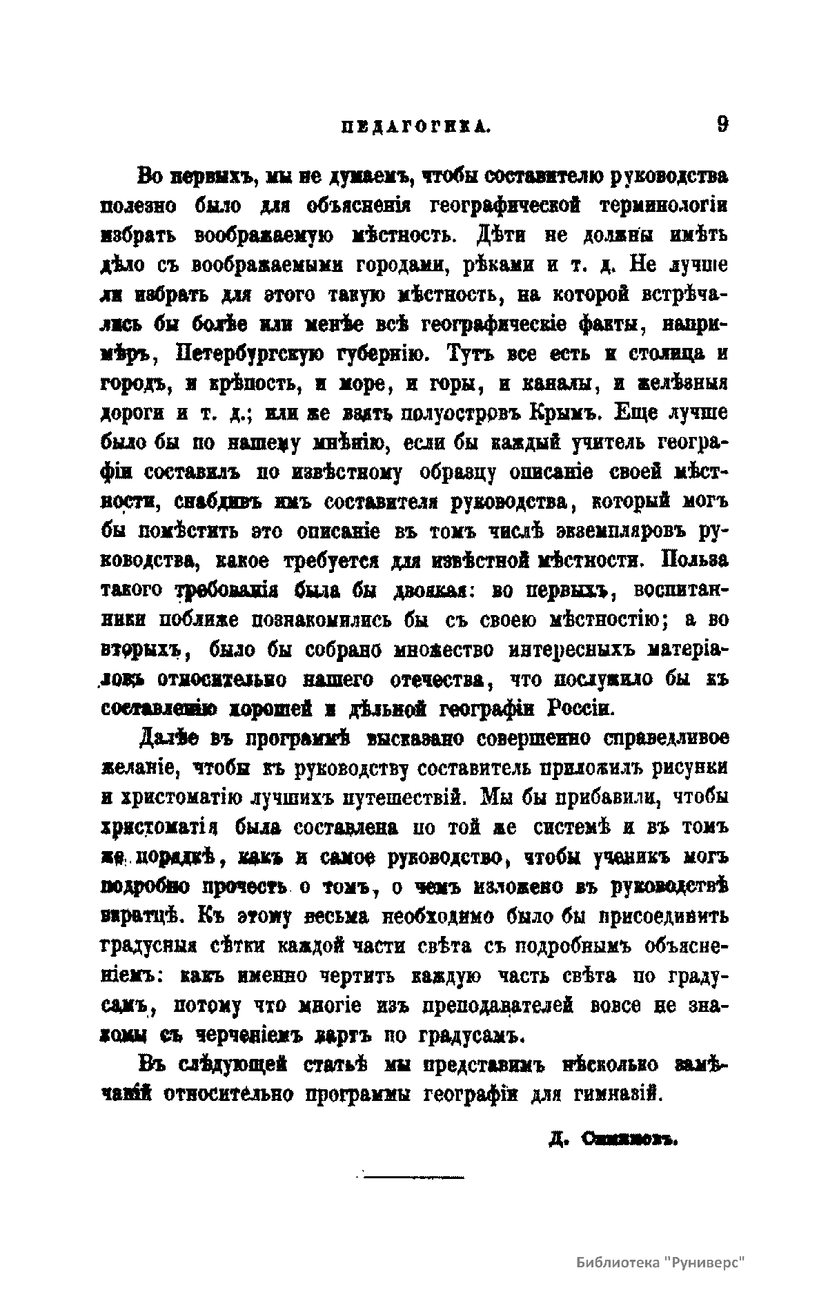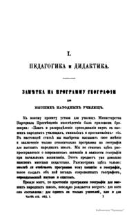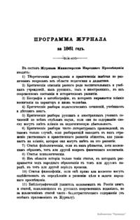 Журнал Министерства народного просвещения выходил с 1834-го по 1917 год. Официальный периодический журнал об успехах просвещения в России. Издатели журнала уверены в том, что «если для каждого человека необходим выход из грубой тьмы невежества и беспрерывное дальнейшее движение к свету, то для народов необходимо попечительное участие правительства в образовании. Только правительство имеет все средства знать и высоту успехов всемирного образования, и настоящие нужды Отечества».