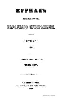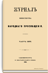 Журнал Министерства народного просвещения выходил с 1834-го по 1917 год. Официальный периодический журнал об успехах просвещения в России. Издатели журнала уверены в том, что «если для каждого человека необходим выход из грубой тьмы невежества и беспрерывное дальнейшее движение к свету, то для народов необходимо попечительное участие правительства в образовании. Только правительство имеет все средства знать и высоту успехов всемирного образования, и настоящие нужды Отечества».