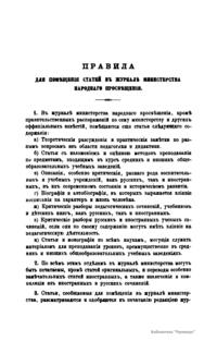 Журнал Министерства народного просвещения выходил с 1834-го по 1917 год. Официальный периодический журнал об успехах просвещения в России. Издатели журнала уверены в том, что «если для каждого человека необходим выход из грубой тьмы невежества и беспрерывное дальнейшее движение к свету, то для народов необходимо попечительное участие правительства в образовании. Только правительство имеет все средства знать и высоту успехов всемирного образования, и настоящие нужды Отечества».