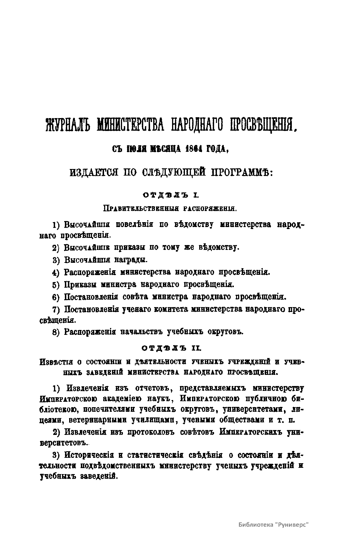 Журнал Министерства народного просвещения выходил с 1834-го по 1917 год. Официальный периодический журнал об успехах просвещения в России. Издатели журнала уверены в том, что «если для каждого человека необходим выход из грубой тьмы невежества и беспрерывное дальнейшее движение к свету, то для народов необходимо попечительное участие правительства в образовании. Только правительство имеет все средства знать и высоту успехов всемирного образования, и настоящие нужды Отечества».