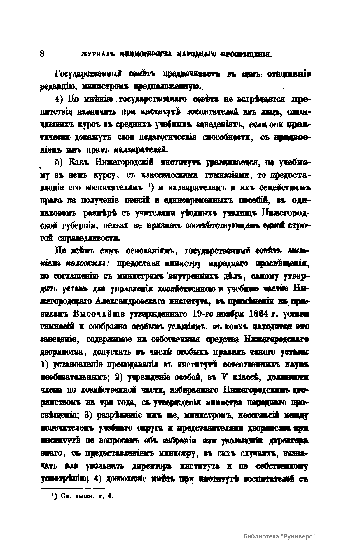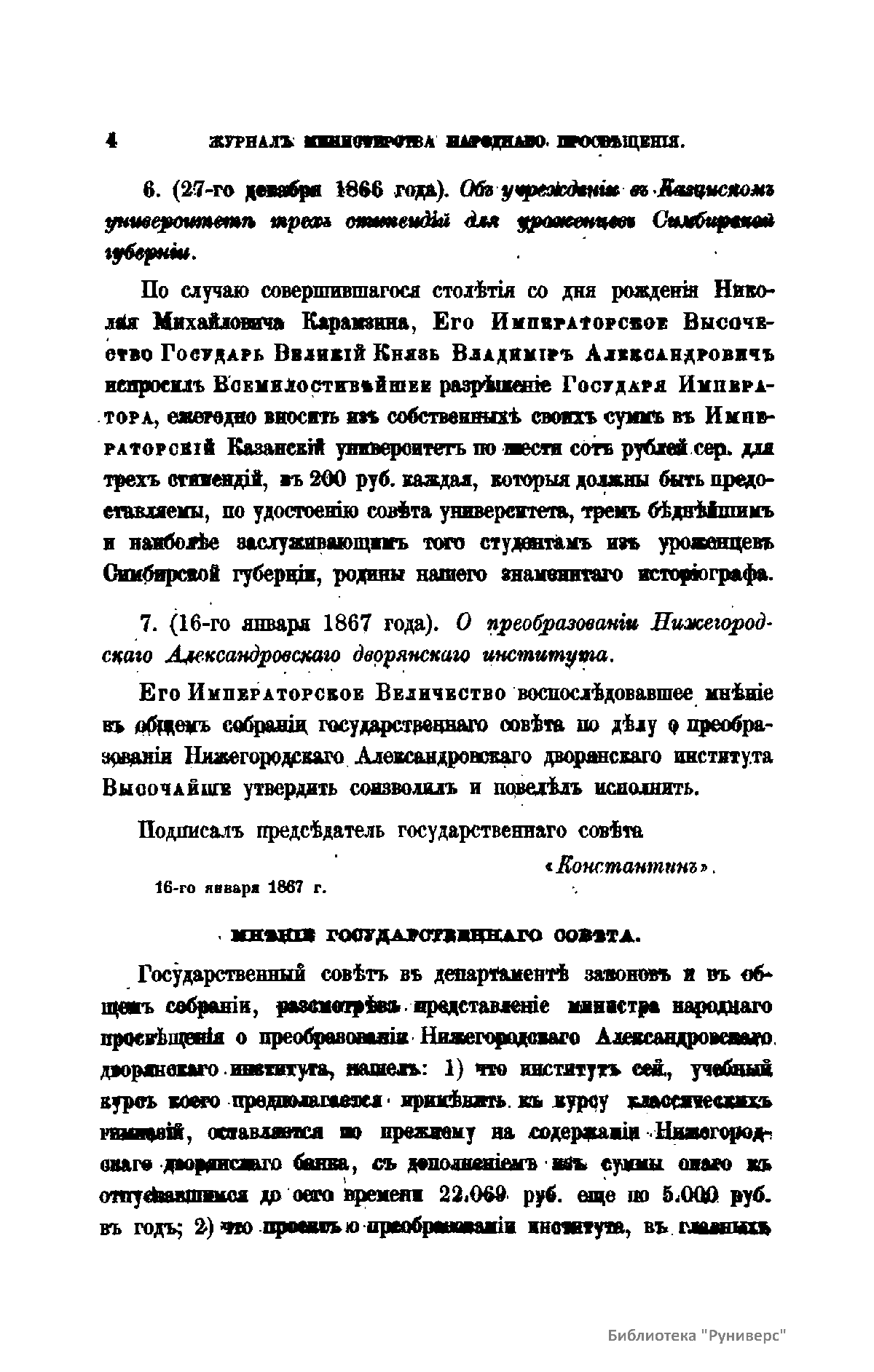 Журнал Министерства народного просвещения выходил с 1834-го по 1917 год. Официальный периодический журнал об успехах просвещения в России. Издатели журнала уверены в том, что «если для каждого человека необходим выход из грубой тьмы невежества и беспрерывное дальнейшее движение к свету, то для народов необходимо попечительное участие правительства в образовании. Только правительство имеет все средства знать и высоту успехов всемирного образования, и настоящие нужды Отечества».
