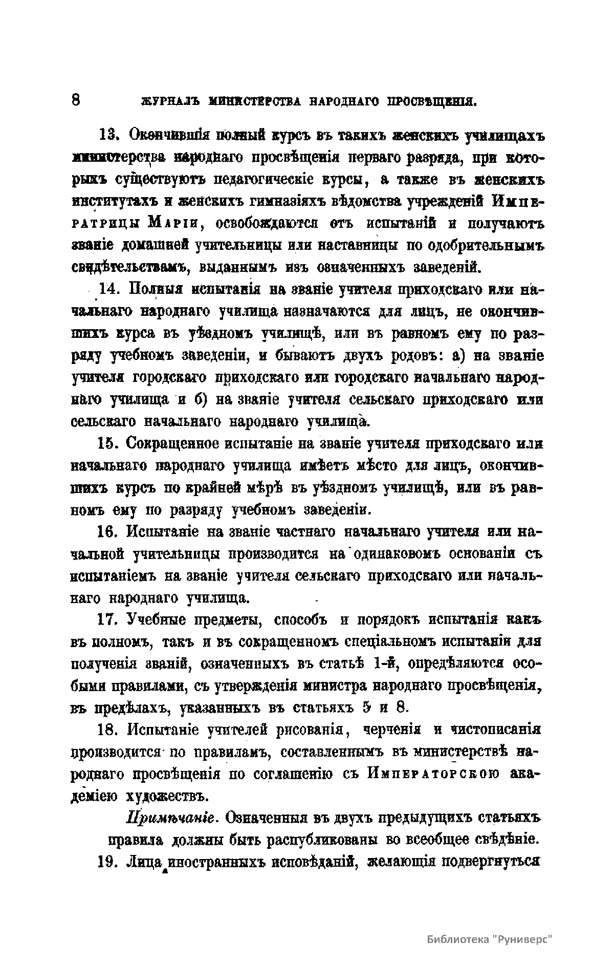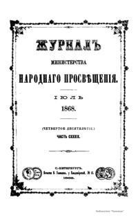 Журнал Министерства народного просвещения выходил с 1834-го по 1917 год. Официальный периодический журнал об успехах просвещения в России. Издатели журнала уверены в том, что «если для каждого человека необходим выход из грубой тьмы невежества и беспрерывное дальнейшее движение к свету, то для народов необходимо попечительное участие правительства в образовании. Только правительство имеет все средства знать и высоту успехов всемирного образования, и настоящие нужды Отечества».
