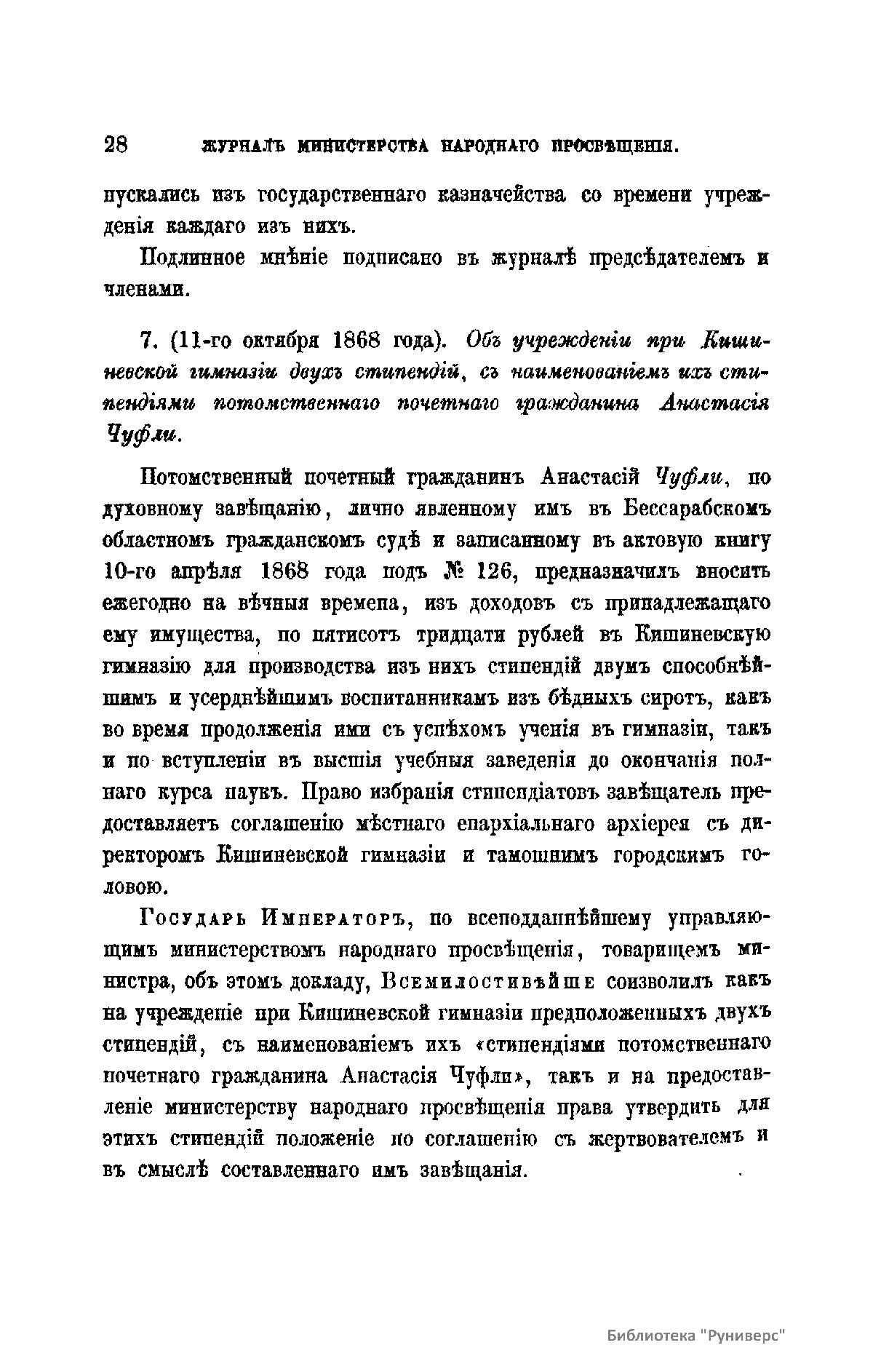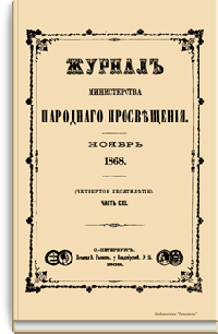 Журнал Министерства народного просвещения выходил с 1834-го по 1917 год. Официальный периодический журнал об успехах просвещения в России. Издатели журнала уверены в том, что «если для каждого человека необходим выход из грубой тьмы невежества и беспрерывное дальнейшее движение к свету, то для народов необходимо попечительное участие правительства в образовании. Только правительство имеет все средства знать и высоту успехов всемирного образования, и настоящие нужды Отечества».