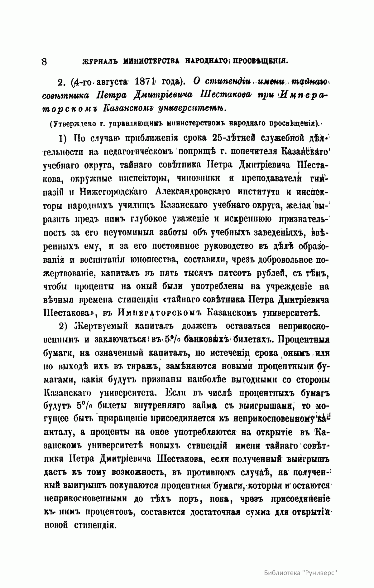 Журнал Министерства народного просвещения выходил с 1834-го по 1917 год. Официальный периодический журнал об успехах просвещения в России. Издатели журнала уверены в том, что «если для каждого человека необходим выход из грубой тьмы невежества и беспрерывное дальнейшее движение к свету, то для народов необходимо попечительное участие правительства в образовании. Только правительство имеет все средства знать и высоту успехов всемирного образования, и настоящие нужды Отечества».