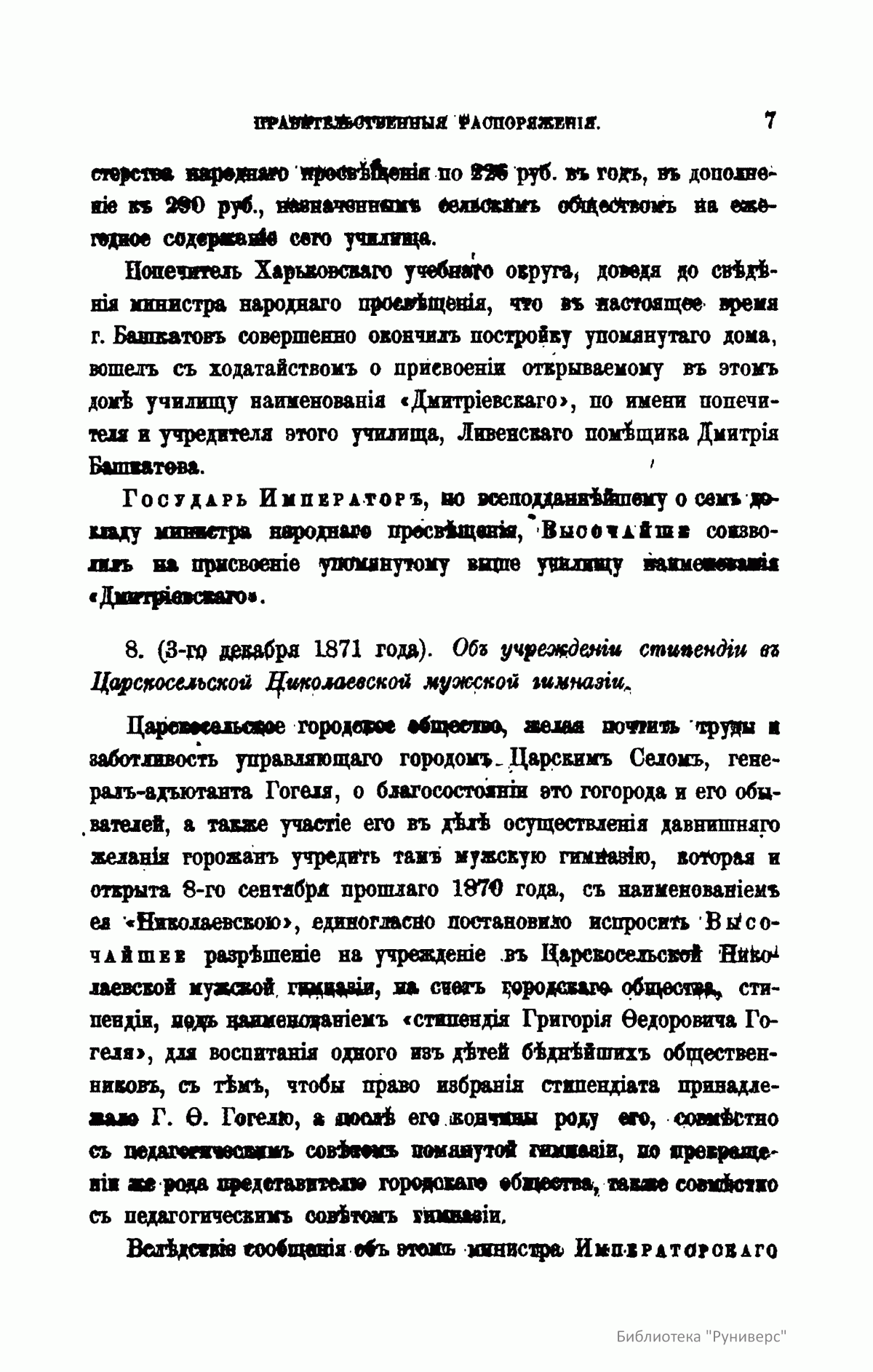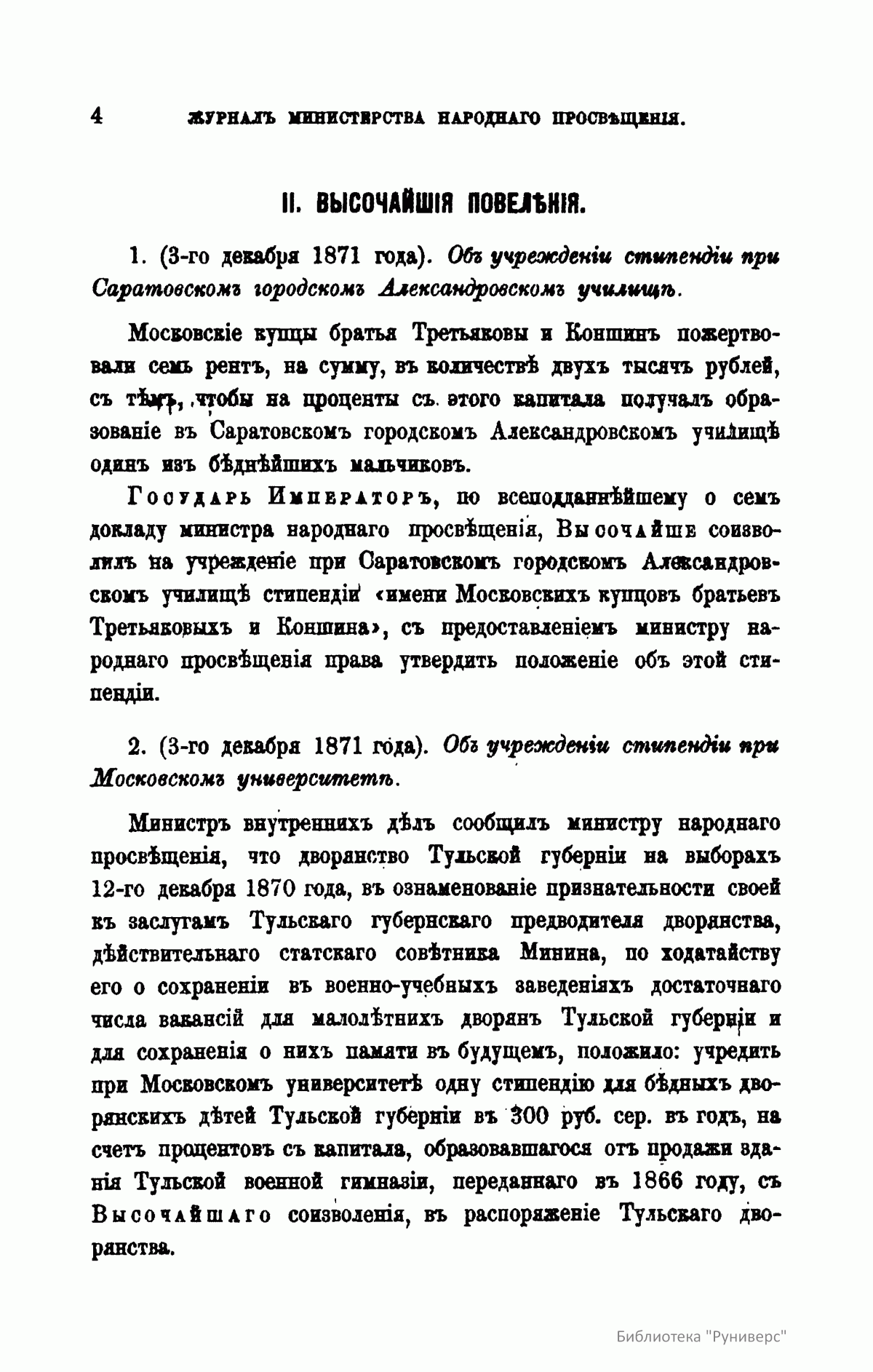 Журнал Министерства народного просвещения выходил с 1834-го по 1917 год. Официальный периодический журнал об успехах просвещения в России. Издатели журнала уверены в том, что «если для каждого человека необходим выход из грубой тьмы невежества и беспрерывное дальнейшее движение к свету, то для народов необходимо попечительное участие правительства в образовании. Только правительство имеет все средства знать и высоту успехов всемирного образования, и настоящие нужды Отечества».