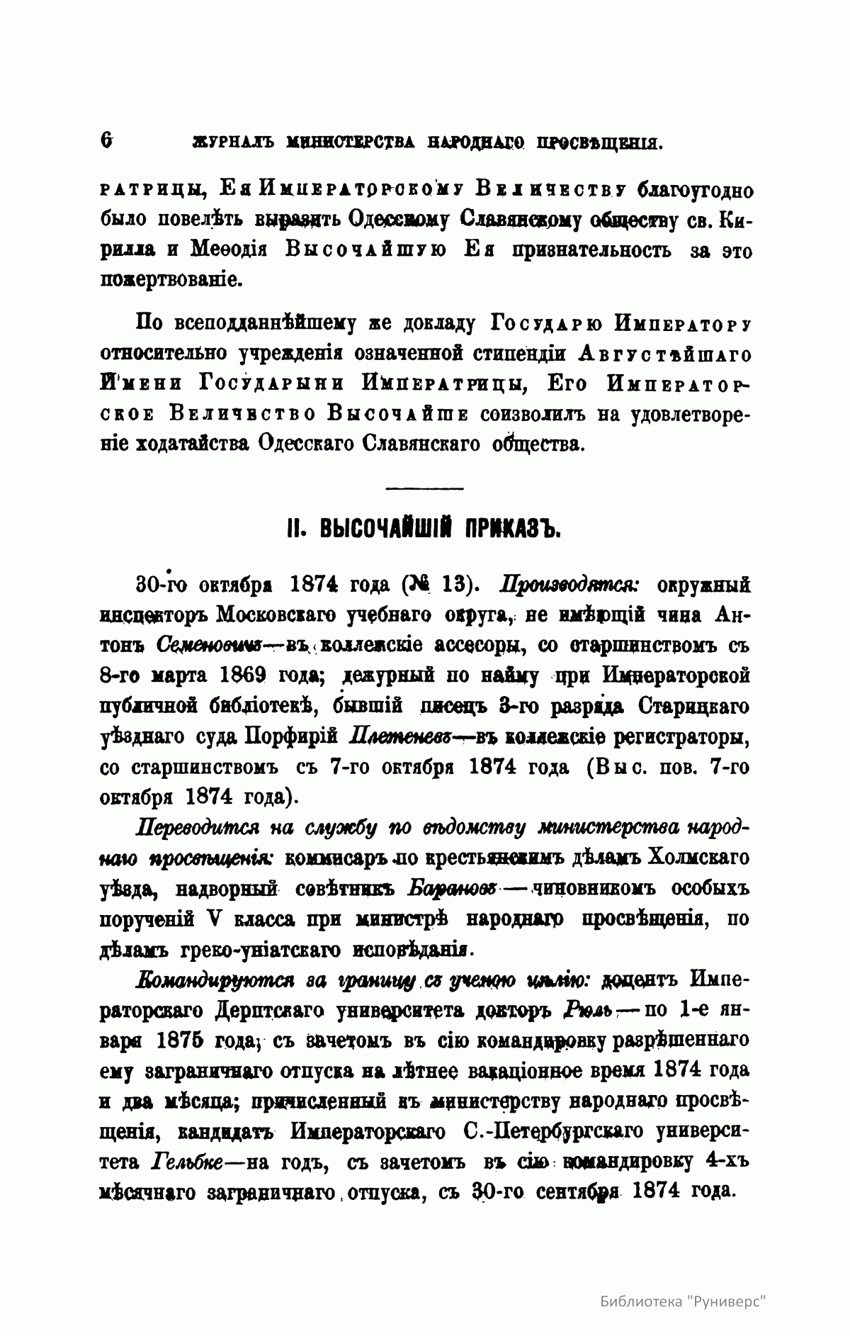 Журнал Министерства народного просвещения выходил с 1834-го по 1917 год. Официальный периодический журнал об успехах просвещения в России. Издатели журнала уверены в том, что «если для каждого человека необходим выход из грубой тьмы невежества и беспрерывное дальнейшее движение к свету, то для народов необходимо попечительное участие правительства в образовании. Только правительство имеет все средства знать и высоту успехов всемирного образования, и настоящие нужды Отечества».