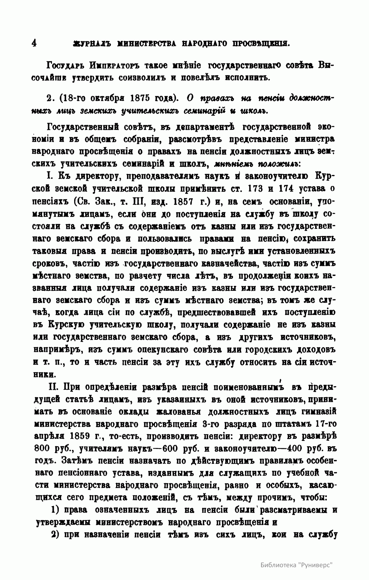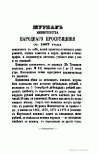 Журнал Министерства народного просвещения выходил с 1834-го по 1917 год. Официальный периодический журнал об успехах просвещения в России. Издатели журнала уверены в том, что «если для каждого человека необходим выход из грубой тьмы невежества и беспрерывное дальнейшее движение к свету, то для народов необходимо попечительное участие правительства в образовании. Только правительство имеет все средства знать и высоту успехов всемирного образования, и настоящие нужды Отечества».