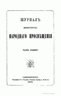 Журнал Министерства народного просвещения выходил с 1834-го по 1917 год. Официальный периодический журнал об успехах просвещения в России. Издатели журнала уверены в том, что «если для каждого человека необходим выход из грубой тьмы невежества и беспрерывное дальнейшее движение к свету, то для народов необходимо попечительное участие правительства в образовании. Только правительство имеет все средства знать и высоту успехов всемирного образования, и настоящие нужды Отечества».