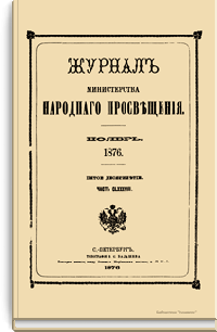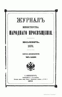 Журнал Министерства народного просвещения выходил с 1834-го по 1917 год. Официальный периодический журнал об успехах просвещения в России. Издатели журнала уверены в том, что «если для каждого человека необходим выход из грубой тьмы невежества и беспрерывное дальнейшее движение к свету, то для народов необходимо попечительное участие правительства в образовании. Только правительство имеет все средства знать и высоту успехов всемирного образования, и настоящие нужды Отечества».