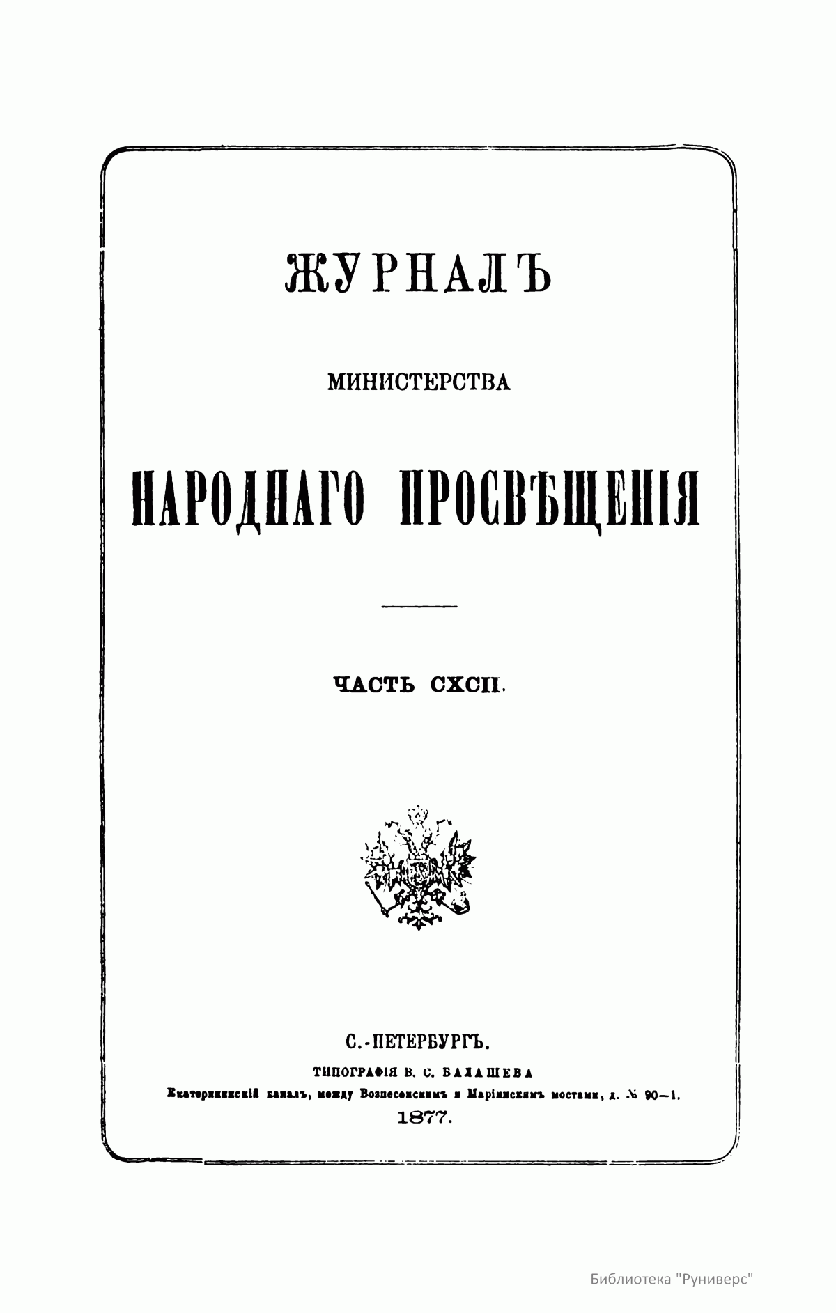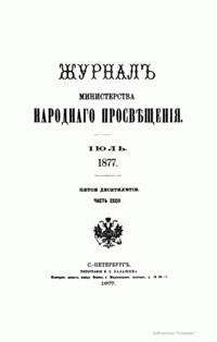 Журнал Министерства народного просвещения выходил с 1834-го по 1917 год. Официальный периодический журнал об успехах просвещения в России. Издатели журнала уверены в том, что «если для каждого человека необходим выход из грубой тьмы невежества и беспрерывное дальнейшее движение к свету, то для народов необходимо попечительное участие правительства в образовании. Только правительство имеет все средства знать и высоту успехов всемирного образования, и настоящие нужды Отечества».