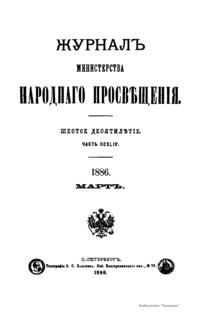 Журнал Министерства народного просвещения выходил с 1834-го по 1917 год. Официальный периодический журнал об успехах просвещения в России. Издатели журнала уверены в том, что «если для каждого человека необходим выход из грубой тьмы невежества и беспрерывное дальнейшее движение к свету, то для народов необходимо попечительное участие правительства в образовании. Только правительство имеет все средства знать и высоту успехов всемирного образования, и настоящие нужды Отечества».