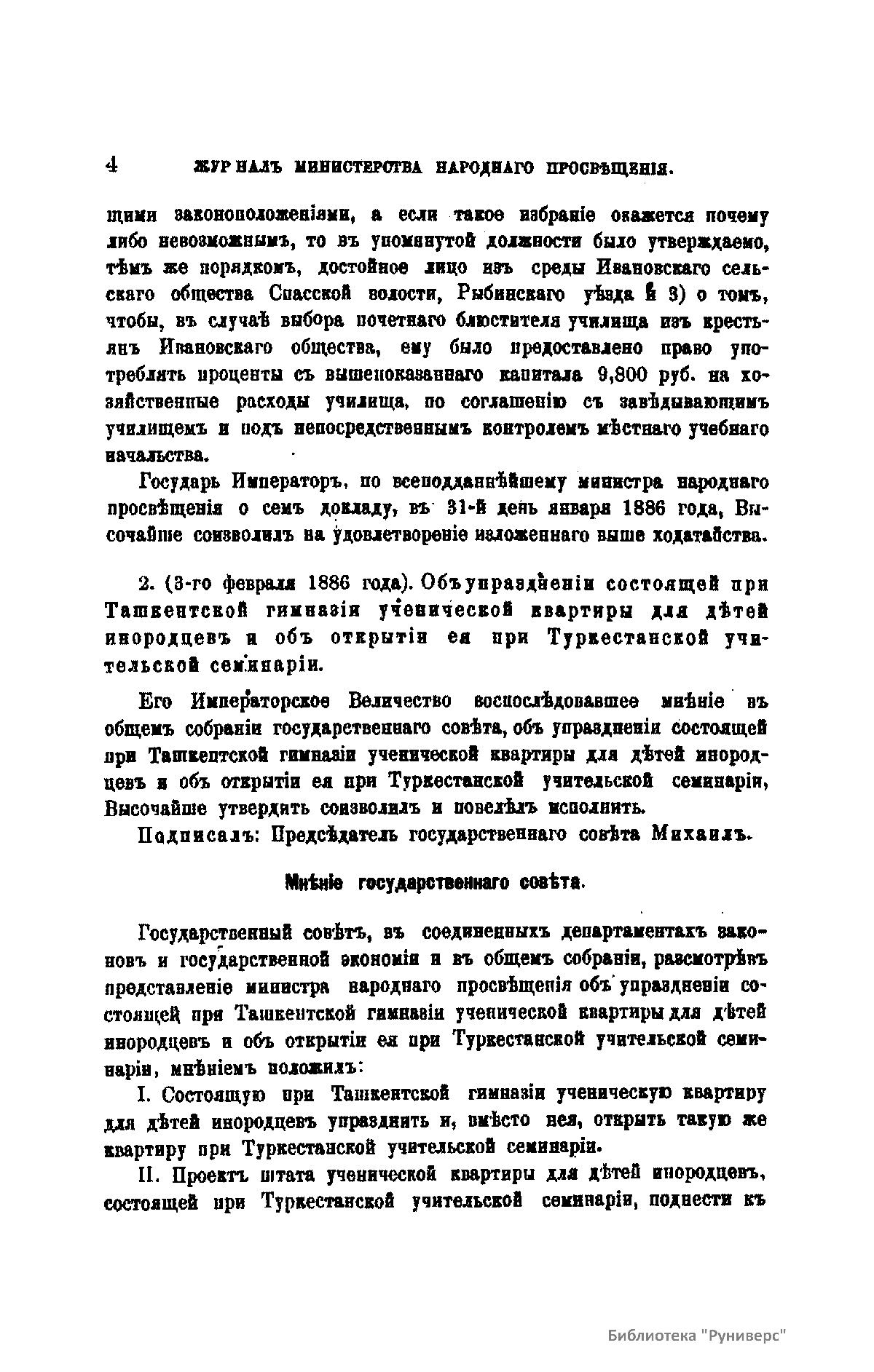 Журнал Министерства народного просвещения выходил с 1834-го по 1917 год. Официальный периодический журнал об успехах просвещения в России. Издатели журнала уверены в том, что «если для каждого человека необходим выход из грубой тьмы невежества и беспрерывное дальнейшее движение к свету, то для народов необходимо попечительное участие правительства в образовании. Только правительство имеет все средства знать и высоту успехов всемирного образования, и настоящие нужды Отечества».