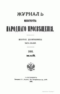 Журнал Министерства народного просвещения выходил с 1834-го по 1917 год. Официальный периодический журнал об успехах просвещения в России. Издатели журнала уверены в том, что «если для каждого человека необходим выход из грубой тьмы невежества и беспрерывное дальнейшее движение к свету, то для народов необходимо попечительное участие правительства в образовании. Только правительство имеет все средства знать и высоту успехов всемирного образования, и настоящие нужды Отечества».