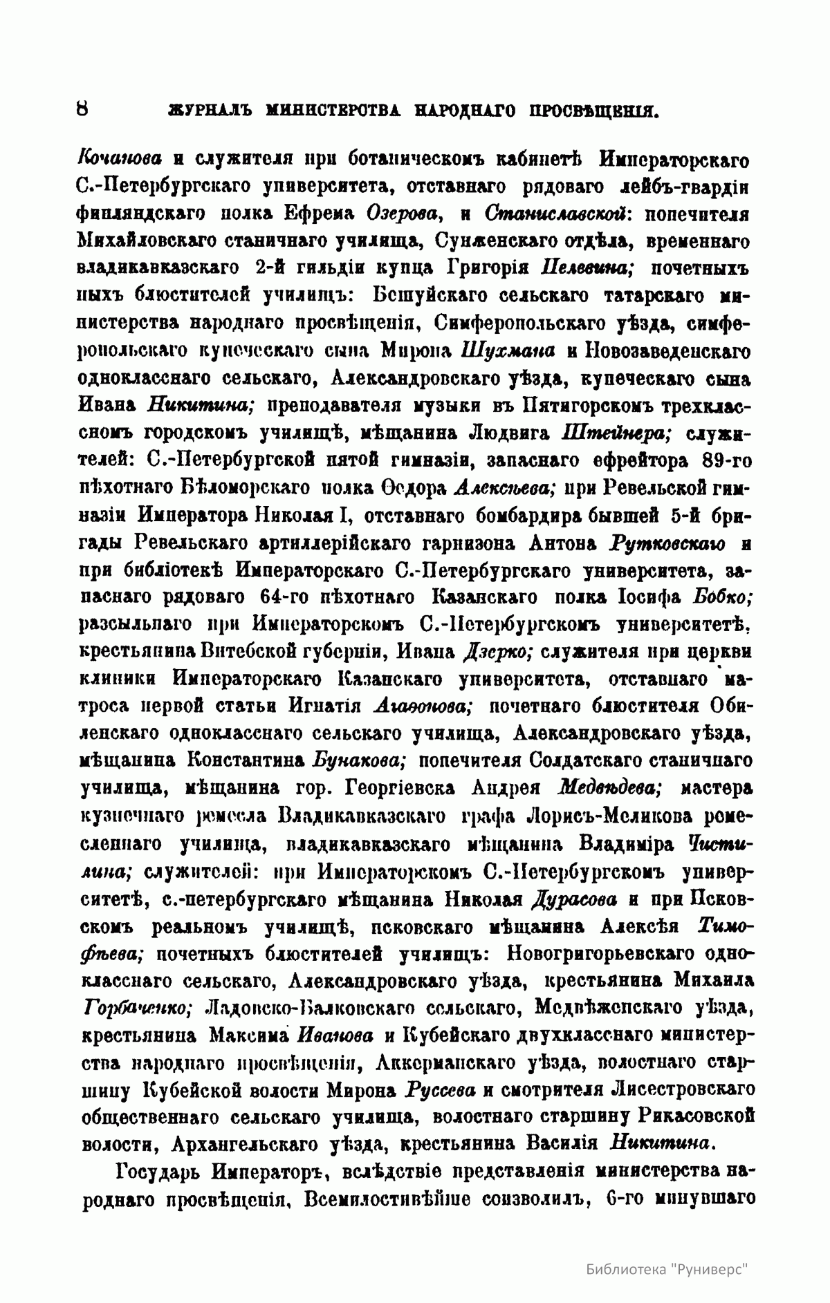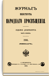 Журнал Министерства народного просвещения выходил с 1834-го по 1917 год. Официальный периодический журнал об успехах просвещения в России. Издатели журнала уверены в том, что «если для каждого человека необходим выход из грубой тьмы невежества и беспрерывное дальнейшее движение к свету, то для народов необходимо попечительное участие правительства в образовании. Только правительство имеет все средства знать и высоту успехов всемирного образования, и настоящие нужды Отечества».