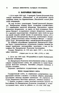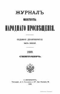 Журнал Министерства народного просвещения выходил с 1834-го по 1917 год. Официальный периодический журнал об успехах просвещения в России. Издатели журнала уверены в том, что «если для каждого человека необходим выход из грубой тьмы невежества и беспрерывное дальнейшее движение к свету, то для народов необходимо попечительное участие правительства в образовании. Только правительство имеет все средства знать и высоту успехов всемирного образования, и настоящие нужды Отечества».