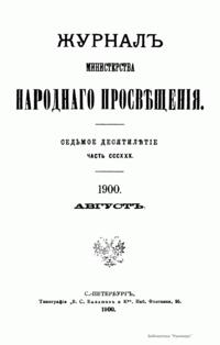 Журнал Министерства народного просвещения выходил с 1834-го по 1917 год. Официальный периодический журнал об успехах просвещения в России. Издатели журнала уверены в том, что «если для каждого человека необходим выход из грубой тьмы невежества и беспрерывное дальнейшее движение к свету, то для народов необходимо попечительное участие правительства в образовании. Только правительство имеет все средства знать и высоту успехов всемирного образования, и настоящие нужды Отечества».