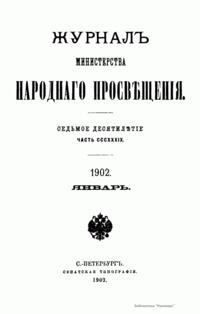 Журнал Министерства народного просвещения выходил с 1834-го по 1917 год. Официальный периодический журнал об успехах просвещения в России. Издатели журнала уверены в том, что «если для каждого человека необходим выход из грубой тьмы невежества и беспрерывное дальнейшее движение к свету, то для народов необходимо попечительное участие правительства в образовании. Только правительство имеет все средства знать и высоту успехов всемирного образования, и настоящие нужды Отечества».