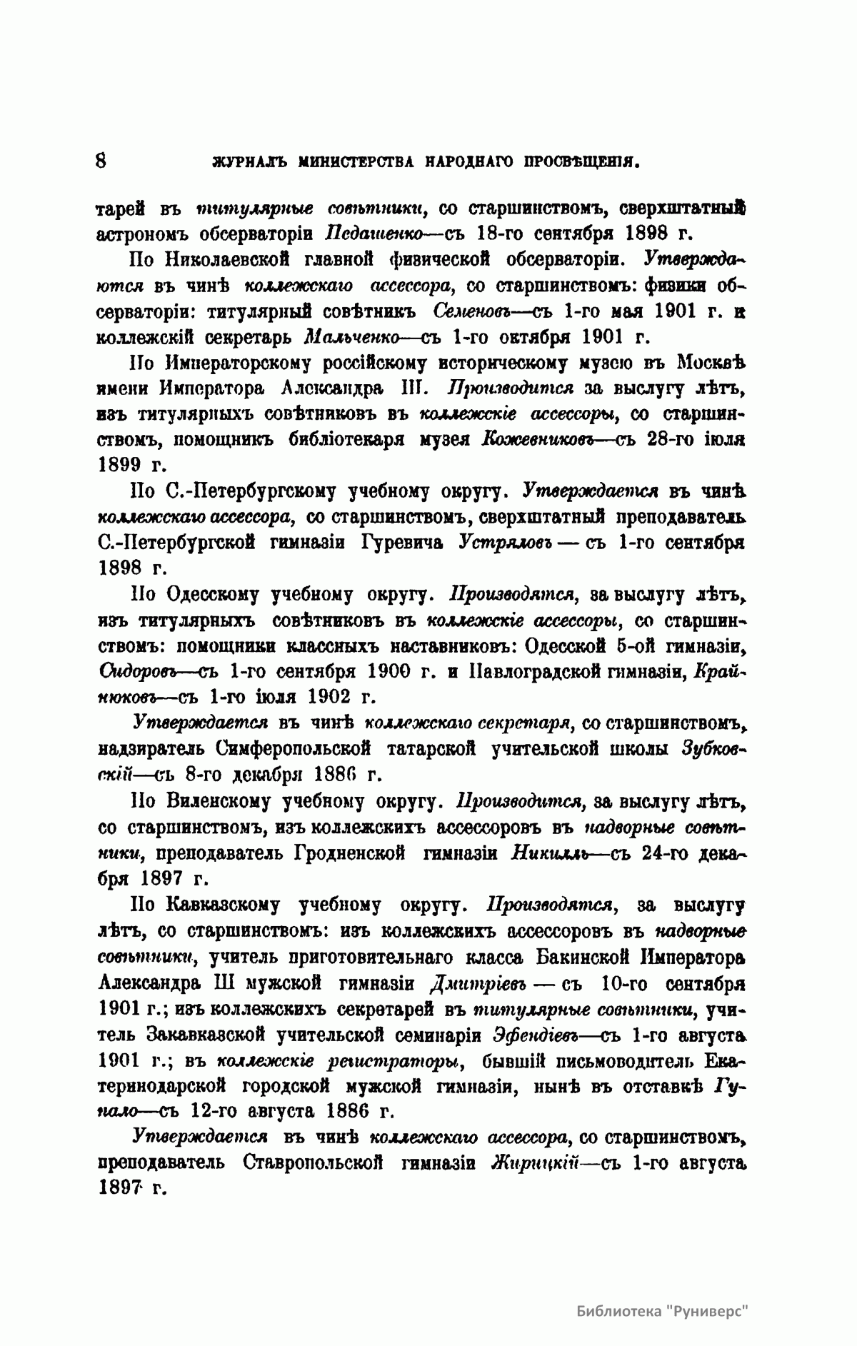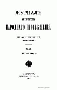 Журнал Министерства народного просвещения выходил с 1834-го по 1917 год. Официальный периодический журнал об успехах просвещения в России. Издатели журнала уверены в том, что «если для каждого человека необходим выход из грубой тьмы невежества и беспрерывное дальнейшее движение к свету, то для народов необходимо попечительное участие правительства в образовании. Только правительство имеет все средства знать и высоту успехов всемирного образования, и настоящие нужды Отечества».