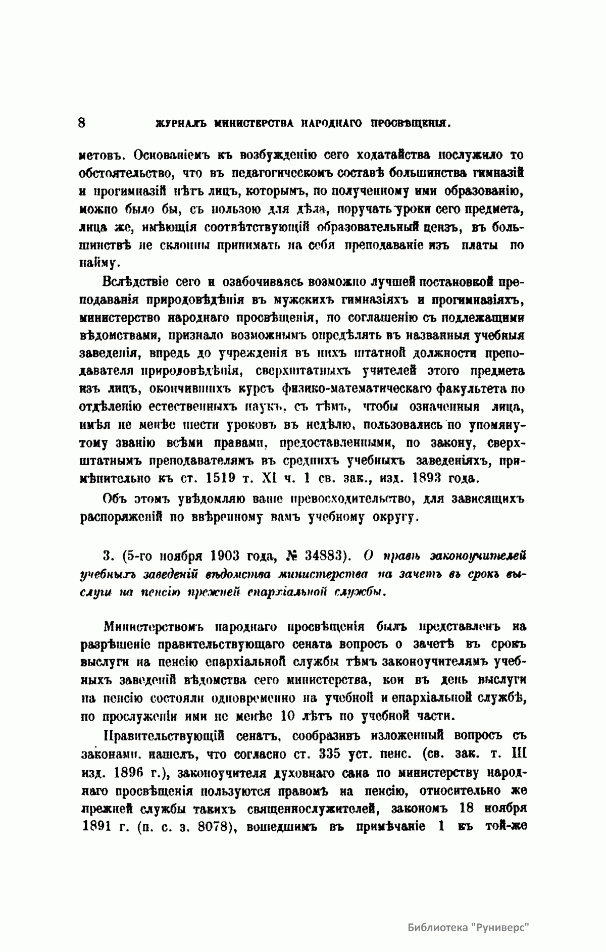 Журнал Министерства народного просвещения выходил с 1834-го по 1917 год. Официальный периодический журнал об успехах просвещения в России. Издатели журнала уверены в том, что «если для каждого человека необходим выход из грубой тьмы невежества и беспрерывное дальнейшее движение к свету, то для народов необходимо попечительное участие правительства в образовании. Только правительство имеет все средства знать и высоту успехов всемирного образования, и настоящие нужды Отечества».