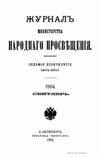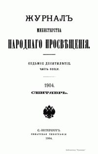 Журнал Министерства народного просвещения выходил с 1834-го по 1917 год. Официальный периодический журнал об успехах просвещения в России. Издатели журнала уверены в том, что «если для каждого человека необходим выход из грубой тьмы невежества и беспрерывное дальнейшее движение к свету, то для народов необходимо попечительное участие правительства в образовании. Только правительство имеет все средства знать и высоту успехов всемирного образования, и настоящие нужды Отечества».