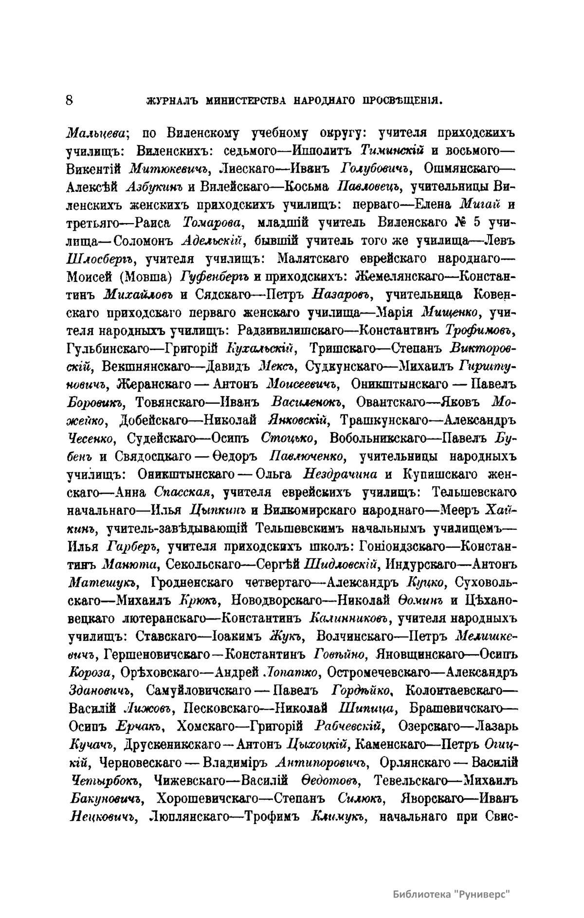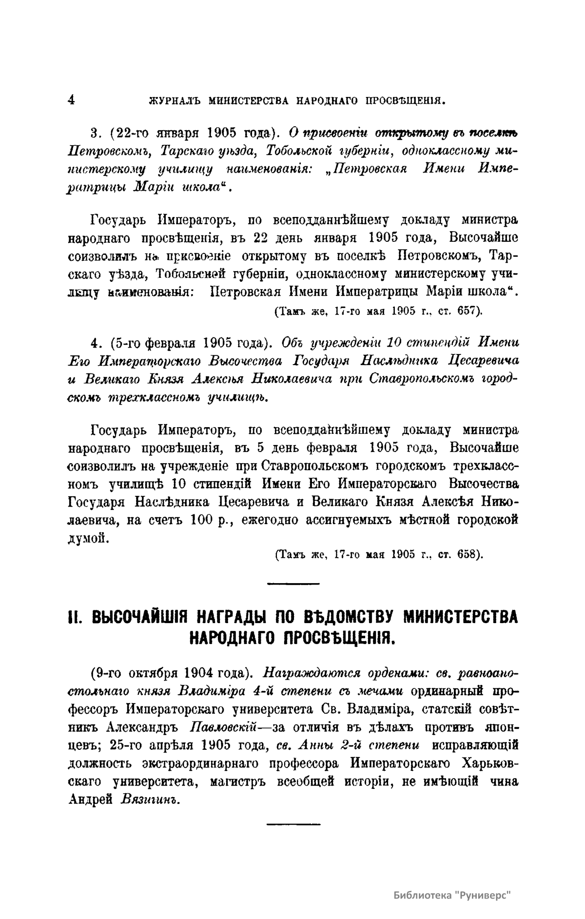 Журнал Министерства народного просвещения выходил с 1834-го по 1917 год. Официальный периодический журнал об успехах просвещения в России. Издатели журнала уверены в том, что «если для каждого человека необходим выход из грубой тьмы невежества и беспрерывное дальнейшее движение к свету, то для народов необходимо попечительное участие правительства в образовании. Только правительство имеет все средства знать и высоту успехов всемирного образования, и настоящие нужды Отечества».