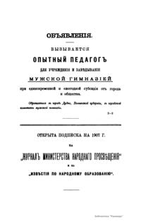 Журнал Министерства народного просвещения выходил с 1834-го по 1917 год. Официальный периодический журнал об успехах просвещения в России. Издатели журнала уверены в том, что «если для каждого человека необходим выход из грубой тьмы невежества и беспрерывное дальнейшее движение к свету, то для народов необходимо попечительное участие правительства в образовании. Только правительство имеет все средства знать и высоту успехов всемирного образования, и настоящие нужды Отечества».