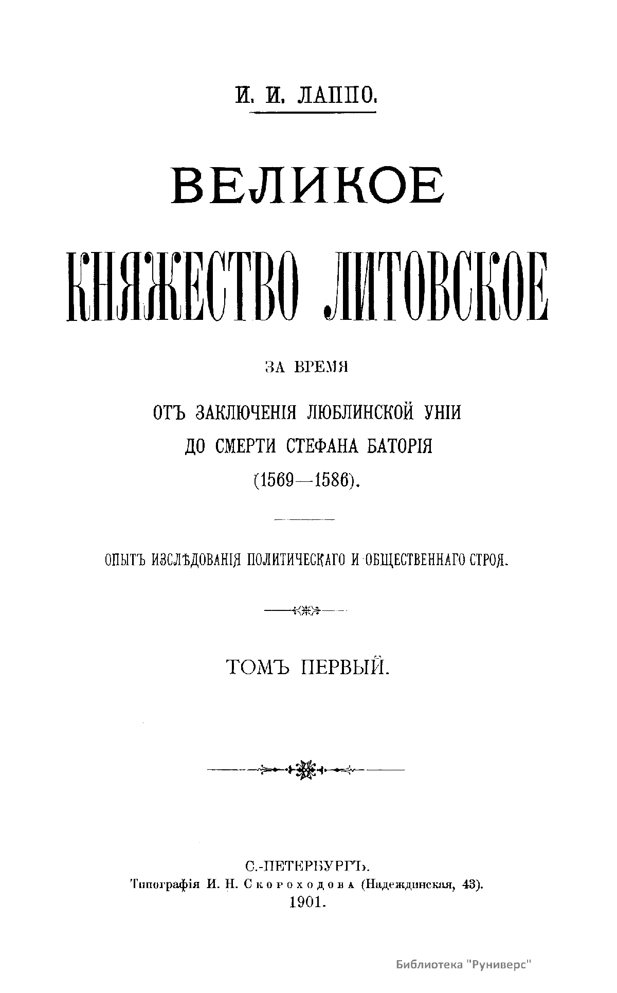 Исследование «Великое княжество Литовское за время от заключения Люблинской унии до смерти Стефана Батория» было представлено автором в качестве диссертации на соискание должности приват-доцента Петербургского университета и заслужило восторженные отзывы таких выдающихся историков, как С. Ф. Платонов и М. К. Любавский. Лаппо ввел в научный оборот множество ранее неизученных документов по периоду политического объединения Литвы и Польши (1569–1586), которому посвящена книга. Уже во время ее написания Лаппо задумал второй том, охватывающий тот же хронологический период, но в котором рассматривались бы иные вопросы, касающиеся внутреннего устройства и внешнеполитических связей великого княжества Литовского. Однако в ходе работы, которая продолжалась десять лет, научные планы автора изменились. Во второй книге, «Великое княжество Литовское во второй половине XVI столетия. Литовско-русский повет и его сеймик», Лаппо сосредоточился на изучении повета — единицы административно-территориального деления Литовско-русского государства, и системе управления, связанной с этим делением. Ряд архивных документов, обнаруженных автором во время исследования темы, включен в раздел «Приложения».
