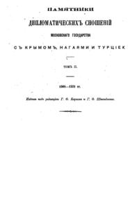 Памятники дипломатических сношений Московского государства с азиатскими народами: Крымом, Казанью, Ногайцами и Турцией. Часть 1-ая (годы с 1474 по 1505).