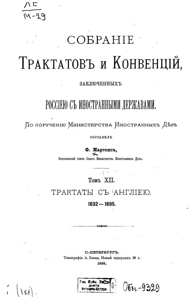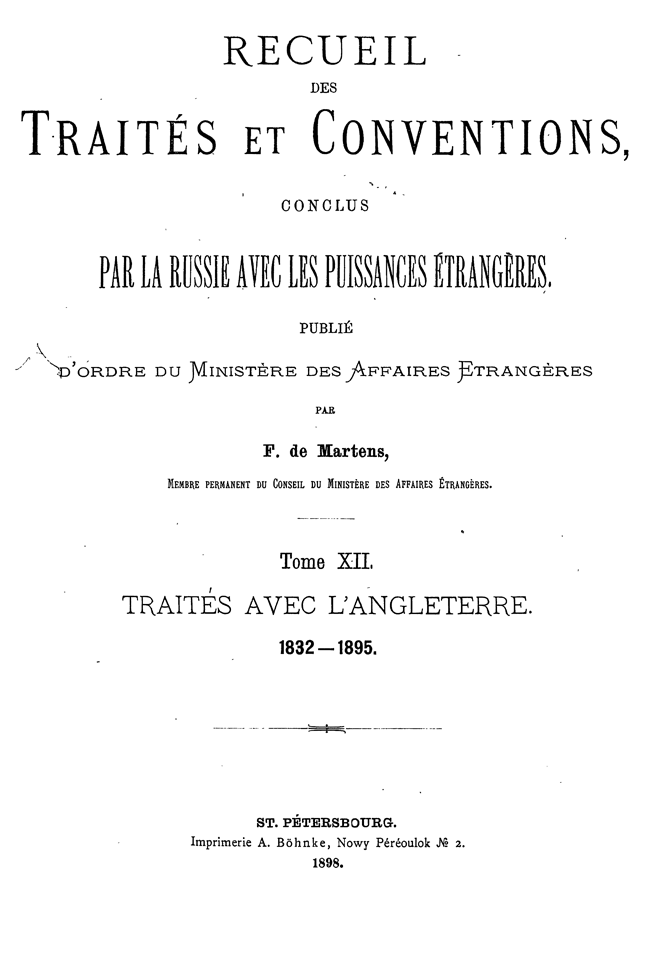 Собрание Трактатов и Конвенций, заключенных Россией с иностранными державами. Том XII. Трактаты с Англией.