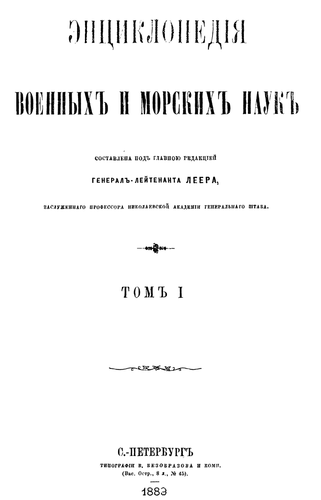 «Энциклопедия военных и морских наук» представляет новое существенно переработанное издание «Военного Энциклопедического Лексикона», генерал-лейтенанта барона Зедделера (1852-1858 г.). Настоящее издание значительно дополнено описанием всех военных явлений в области науки, техники и боевой практики.