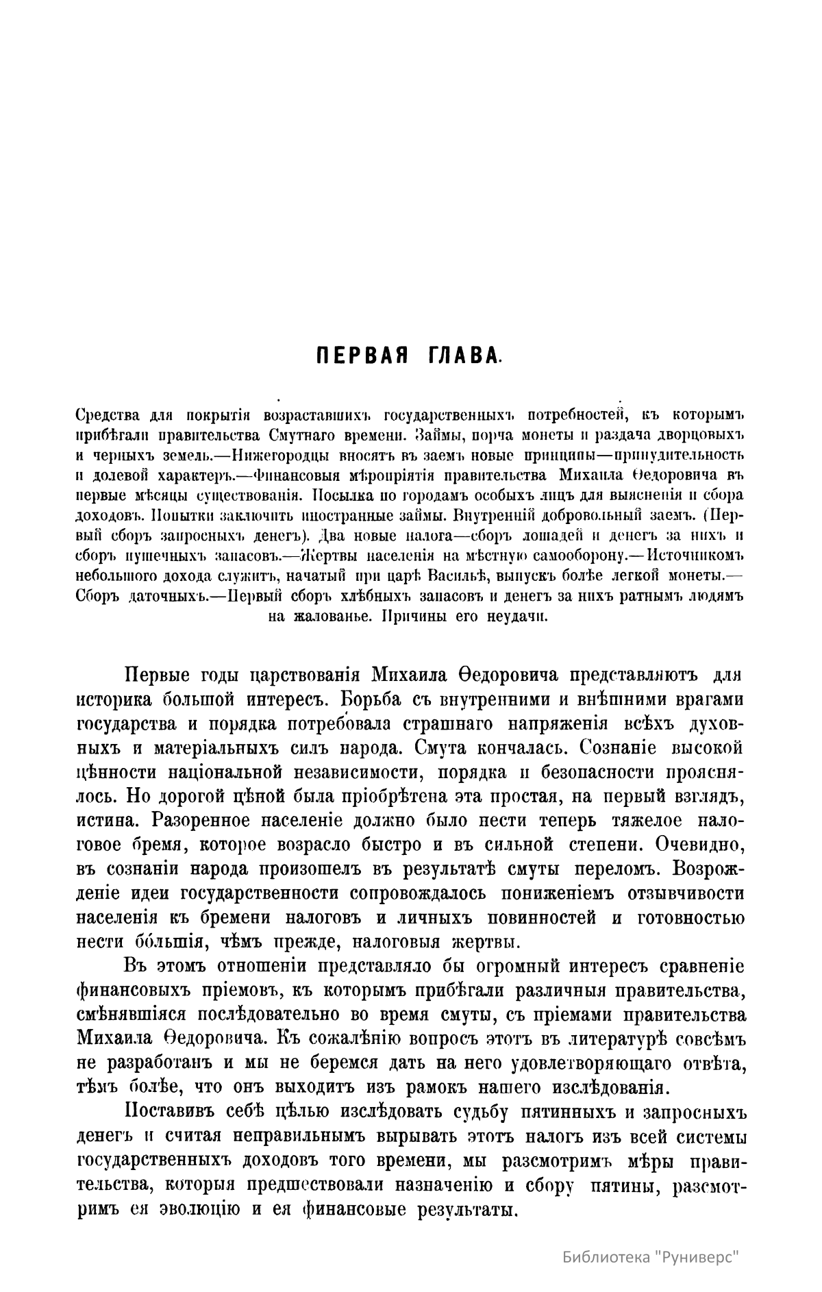 Издание представляет исторический обзор и и публикацию документов, касающиеся введения и сбора чрезвычайных налогов в Русском государстве в начале XVII века, особенно в период правления юного царя Михаила Федоровича. Основное внимание уделяется эволюции "запросных" и "пятинных" денег от добровольных пожертвований к принудительным, а затем и репартиционным налогам, взимаемым с различных слоев населения, включая торговых и посадских людей, а также крестьян.
