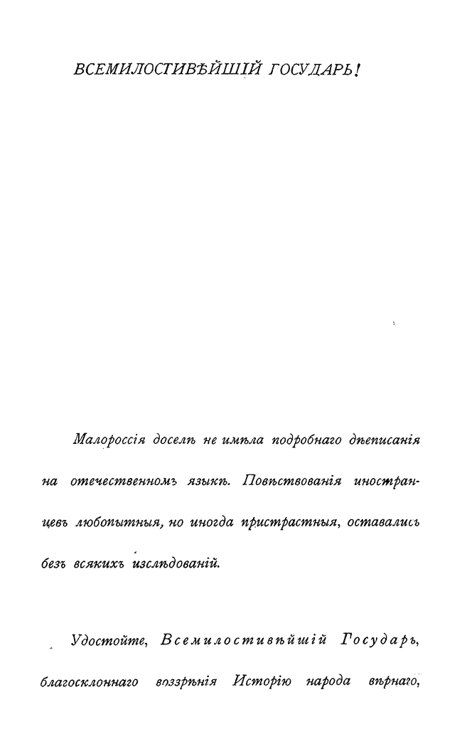 В авторском предисловии Д.Н. Бантыш-Каменский пишет: «Малороссия доселе не имела подробного дееписания на отечественном языке. Повествования иностранцев любопытные, но иногда пристрастные, оставались без всяких исследований. <…> Малороссия, страна обильная происшествиями где каждый город, каждое почти местечко гласят о славе ее обитателей; где искони процветало благочестие; в недрах коей покоится прах первого Законодателя нашего и нескольких мудрых Государей: страна, верная Богу — в оковах, Царям — во время вторжения неприятелей; украсившая век ПЕТРА и ЕКАТЕРИНЫ многими достойными сынами; доселе гордящаяся отраслями их — заслуживала подробного дееписания».