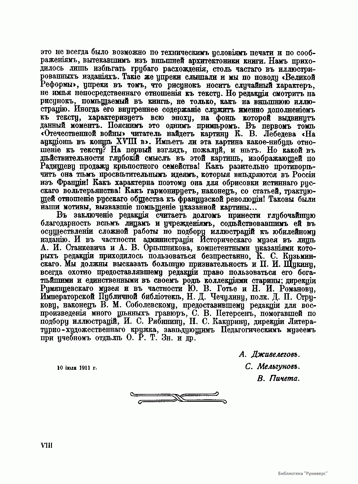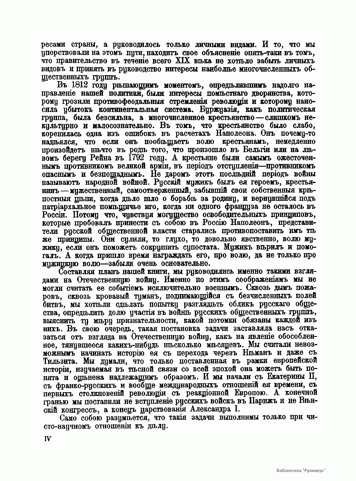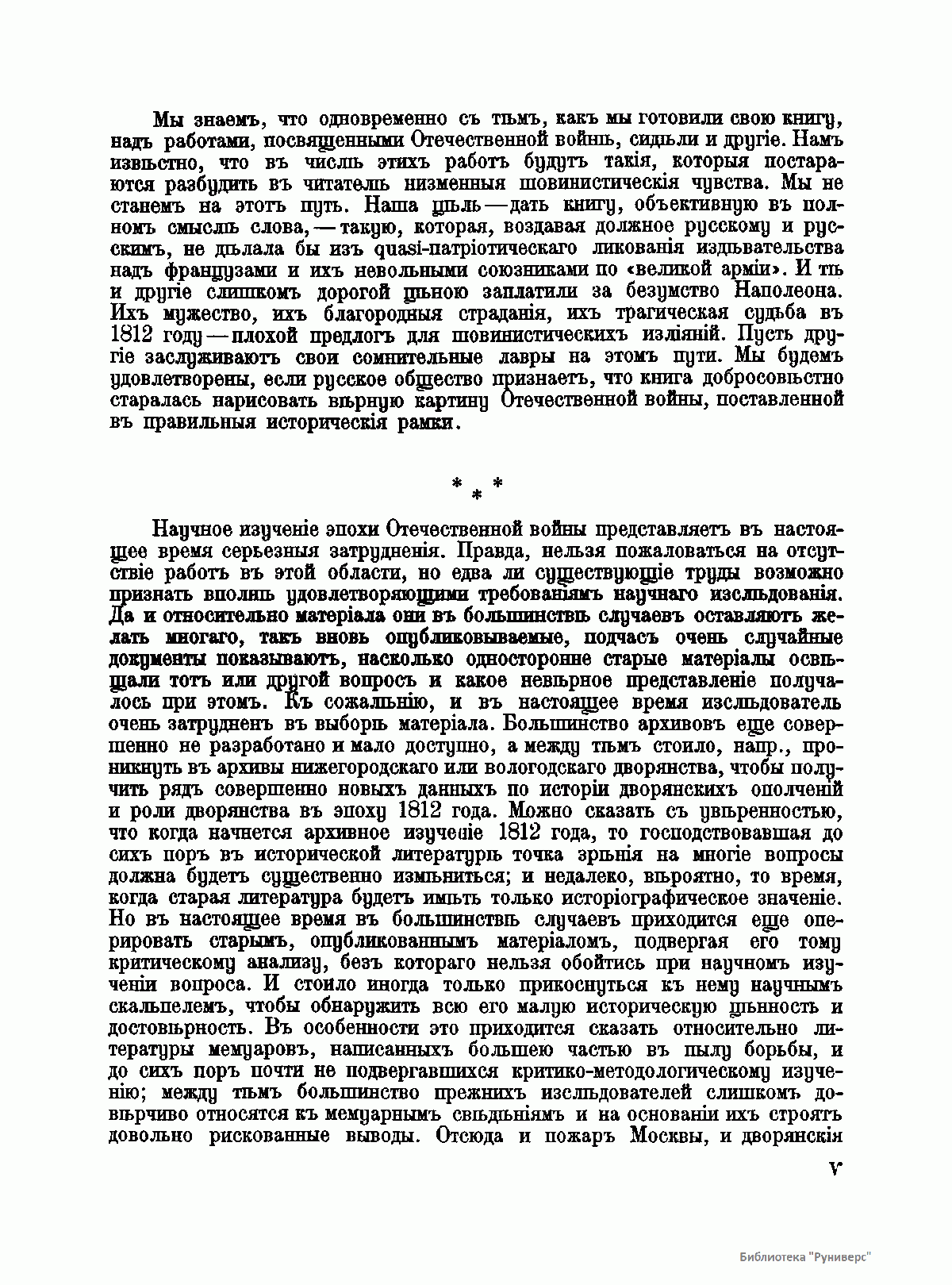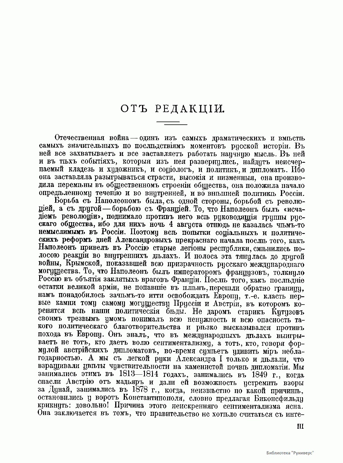 Настоящее научное издание – плод кропотливого коллективного труда Исторической комиссии, которая поставила перед собой цель дать объективную картину событий. Составляя план книги, авторы руководствовались следующими соображениями. Отечественная война 1812 года – один из самых драматических и вместе с тем самых значительных по последствиям моментов русской истории. Только поставленная в рамки европейской истории, изучаемая в тесной связи со всей эпохой, она может быть понята и оценена надлежащим образом. Поэтому книга начинается с эпохи Екатерины II, с франко-русских и вообще международных отношений ее времени, с первых столкновений революции с Европой, а заканчивается не вступлением русских войск в Париж и не Венским конгрессом, а концом царствования Александра I. Авторы критически относятся к политике Александра I в отношении похода в Европу, после того как Наполеон потерпел поражение в России, так как освобождение Европы «положило первые камни» тому самому могуществу Пруссии и Австрии, в котором коренятся все политические беды России. Недаром Кутузов своим трезвым умом понимал всю ненужность и опасность такого политического благотворительства. Причины такой «сентиментальной политики» авторы видят в том, что правительство не хотело считаться с интересами страны, а руководствовалось только личными видами. Такая политика, по мнению авторов, проводилась в течение всего XIX века. Авторы не считают Отечественную войну событием исключительно военным. Они делают попытку разглядеть облик русского общества, определить долю участия в войне русских общественных групп, выяснить ту меру признательности, которой потомки обязаны каждой из них. Многие из авторов имели возможность использовать новые архивные данные, большинству же приходилось оперировать уже опубликованным материалом. Таким образом, издание дает и сводку того материала, который был известен в значительной мере только специалистам. В книге представлены различные иллюстрации.