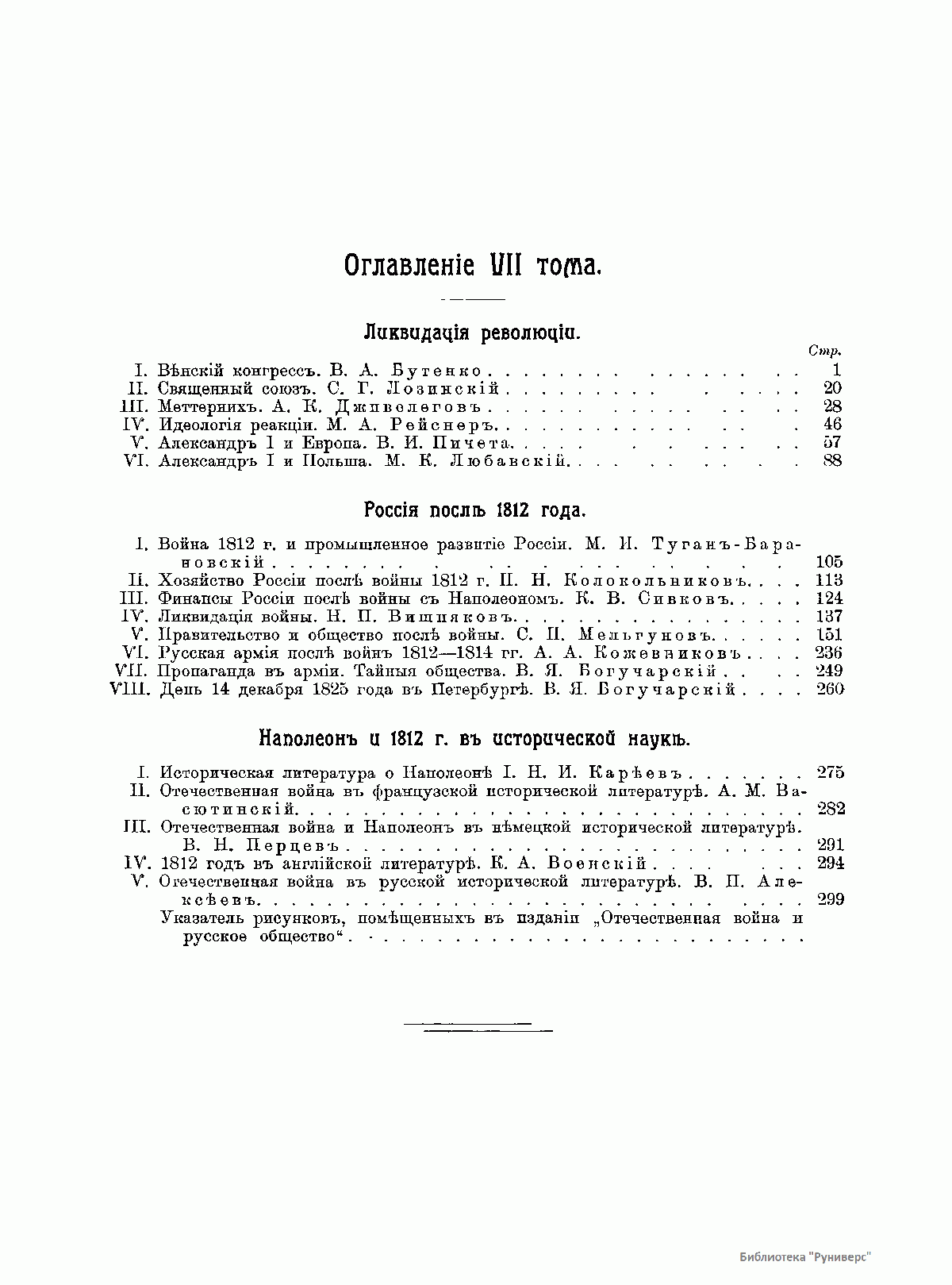 Настоящее научное издание – плод кропотливого коллективного труда Исторической комиссии, которая поставила перед собой цель дать объективную картину событий. Составляя план книги, авторы руководствовались следующими соображениями. Отечественная война 1812 года – один из самых драматических и вместе с тем самых значительных по последствиям моментов русской истории. Только поставленная в рамки европейской истории, изучаемая в тесной связи со всей эпохой, она может быть понята и оценена надлежащим образом. Поэтому книга начинается с эпохи Екатерины II, с франко-русских и вообще международных отношений ее времени, с первых столкновений революции с Европой, а заканчивается не вступлением русских войск в Париж и не Венским конгрессом, а концом царствования Александра I. Авторы критически относятся к политике Александра I в отношении похода в Европу, после того как Наполеон потерпел поражение в России, так как освобождение Европы «положило первые камни» тому самому могуществу Пруссии и Австрии, в котором коренятся все политические беды России. Недаром Кутузов своим трезвым умом понимал всю ненужность и опасность такого политического благотворительства. Причины такой «сентиментальной политики» авторы видят в том, что правительство не хотело считаться с интересами страны, а руководствовалось только личными видами. Такая политика, по мнению авторов, проводилась в течение всего XIX века. Авторы не считают Отечественную войну событием исключительно военным. Они делают попытку разглядеть облик русского общества, определить долю участия в войне русских общественных групп, выяснить ту меру признательности, которой потомки обязаны каждой из них. Многие из авторов имели возможность использовать новые архивные данные, большинству же приходилось оперировать уже опубликованным материалом. Таким образом, издание дает и сводку того материала, который был известен в значительной мере только специалистам. В книге представлены различные иллюстрации.