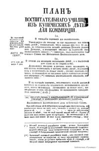 письменное желание основать одно такое училище для ста мальчиков из купеческих семей. На содержание училища Демидов определял капитал в 250 000 рублей. Настоящее издание представляет план училища, поданный Бецким императрице на рассмотрение и утверждение.