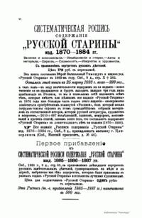 «Русская старина», ежемесячный исторический журнал, выходил в Петербурге в 1870-1918. Основан, издавался и редактировался (1870-1892) М. И. Семевским при участии В. И. Семевского. Последующими редакторами были Н. К. Шильдер (1892-1896), Н. Ф. Дубровин (1896-1904), военные историки С. П. Зыков, П. Н. Воронов.