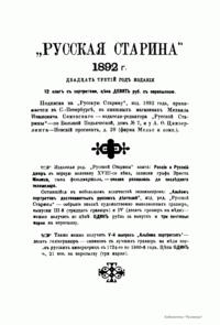 «Русская старина», ежемесячный исторический журнал, выходил в Петербурге в 1870-1918. Основан, издавался и редактировался (1870-1892) М. И. Семевским при участии В. И. Семевского. Последующими редакторами были Н. К. Шильдер (1892-1896), Н. Ф. Дубровин (1896-1904), военные историки С. П. Зыков, П. Н. Воронов.