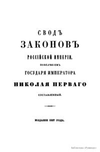 Свод законов Российской империи— официальное собрание расположенных в тематическом порядке действующих законодательных актов Российской империи, созданное при Николае I. Впервые он был напечатан в 1832 году. Манифестом 31 января 1833 года Свод законов был объявлен действующим источником права с 1 января 1835 года. Первое издание 1832 года и последующие 1842-го и 1857 года состояли из пятнадцати томов. После 1857 года Свод законов полностью не переиздавался, а выходили лишь отдельные тома. В качестве отдельного – 16-го тома в 1885 году вышли Судебные уставы. Между изданиями Свода законов выходили ежегодные и сводные (за несколько лет) «Продолжения» Свода законов с указанием на упраздненные и измененные статьи. В своде законов собраны все реально действовавшие в определенный момент времени законы по тем или иным проблемам права, это справочник для юристов. Отбор законодательного материала для включения в Свод производился на основе Полного собрания законов (первое Полное собрание законов, появившееся в 1830 году, состояло из 45 томов, содержащих 30 920 актов и 6 томов приложений). Собрание законов – это в большой степени историческое издание. По нему можно изучать развитие, направление правительственной мысли в стране. Это летопись отечественного законотворчества. Изучая страницу за страницей эту летопись, мы можем узнать, что в тот или иной момент истории являлось злобой дня.