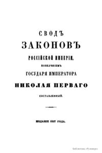 Свод законов Российской империи— официальное собрание расположенных в тематическом порядке действующих законодательных актов Российской империи, созданное при Николае I. Впервые он был напечатан в 1832 году. Манифестом 31 января 1833 года Свод законов был объявлен действующим источником права с 1 января 1835 года. Первое издание 1832 года и последующие 1842-го и 1857 года состояли из пятнадцати томов. После 1857 года Свод законов полностью не переиздавался, а выходили лишь отдельные тома. В качестве отдельного – 16-го тома в 1885 году вышли Судебные уставы. Между изданиями Свода законов выходили ежегодные и сводные (за несколько лет) «Продолжения» Свода законов с указанием на упраздненные и измененные статьи. В своде законов собраны все реально действовавшие в определенный момент времени законы по тем или иным проблемам права, это справочник для юристов. Отбор законодательного материала для включения в Свод производился на основе Полного собрания законов (первое Полное собрание законов, появившееся в 1830 году, состояло из 45 томов, содержащих 30 920 актов и 6 томов приложений). Собрание законов – это в большой степени историческое издание. По нему можно изучать развитие, направление правительственной мысли в стране. Это летопись отечественного законотворчества. Изучая страницу за страницей эту летопись, мы можем узнать, что в тот или иной момент истории являлось злобой дня.